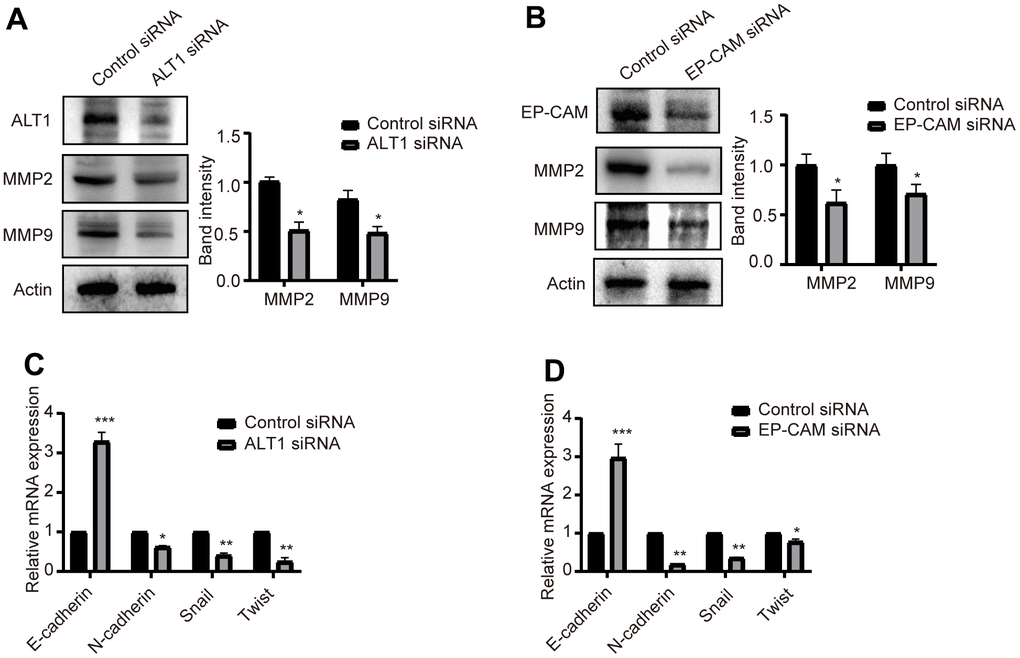Alterations in MMP levels and EMT are closely related to the migration and invasion of cancers. Western blot detection showed that the expression of MMP2 and MMP9 was suppressed when ALT1 and EP-CAM were knocked down (Figure 10A). Furthermore, RT-qPCR was used to verify the EMT-related markers E-cadherin, N-cadherin, Snail, and Twist. Despite increased expression of the E-cadherin mRNA, the expression of N-cadherin, Snail, and Twist was decreased. (Figure 10B) These results suggested that after ALT1 interacted with EP-CAM, it participated in the migration and invasion of HepG2 cells by influencing EMT and MMPs.