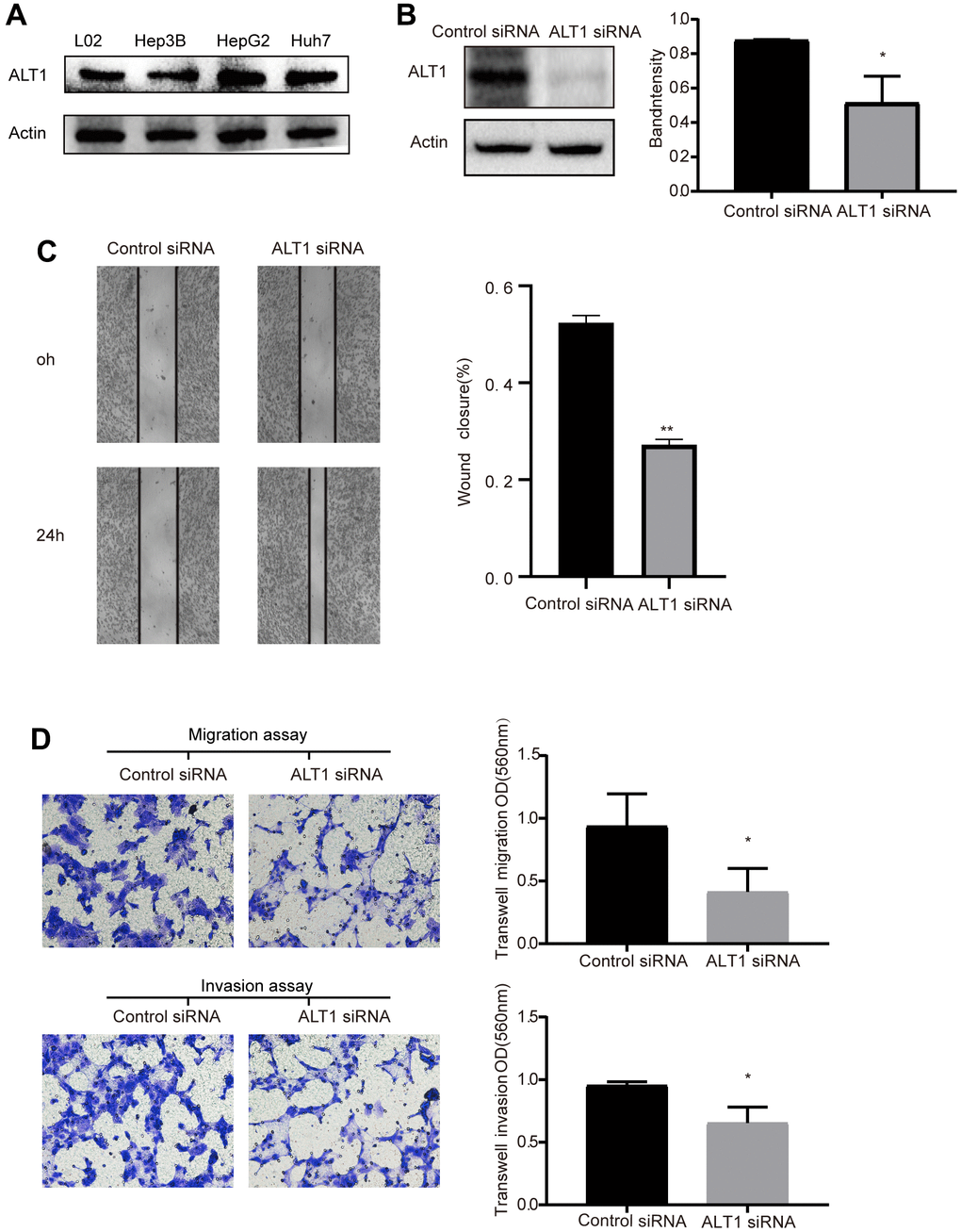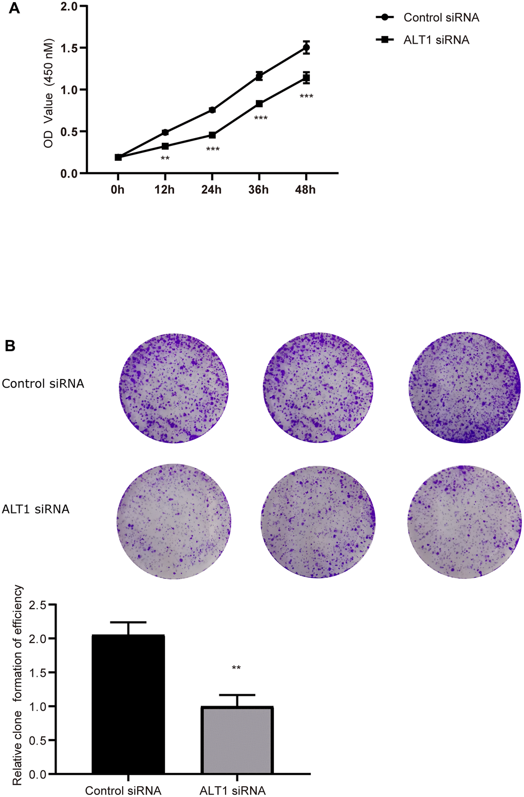 Wound healing and transwell assays were performed to assess the effects of ALT1-knockdown on the migration and invasion of HepG2 cells. ALT1 specific siRNA suppressed the ALT1 expression (Figure 2B). Second, the results of the wound healing assay demonstrated that ALT1-knockdown significantly inhibited the migration of HepG2 cells compared with the negative control group (Figure 2C). Additionally, we also used a transwell assay to measure the migration and invasion ability of HepG2 cells. The OD values indicated that the migration and invasion capabilities of HepG2 cells were significantly decreased by suppressing ALT1 (Figure 2D).