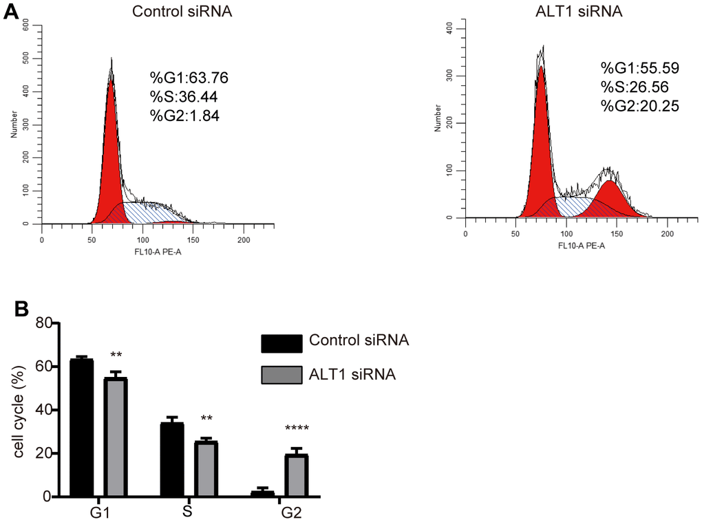 The CCK-8 and colony formation assays showed vast differences between the ALT1-knockdown group and the negative control group, which implied that the proliferation of HepG2 cells was inhibited by suppressing ALT1 (Figure 3A, 3B). Additionally, flow cytometry suggested that the apoptosis rate of the ALT1-knockdown group was remarkably greater than that of the control group (Figure 4). The cell cycle analysis demonstrated the number of cells in G1 and S phases decreased, while the number of cells in G2 phase increased significantly, suggesting that cell arrest occurred in G2 phase (Figure 5).