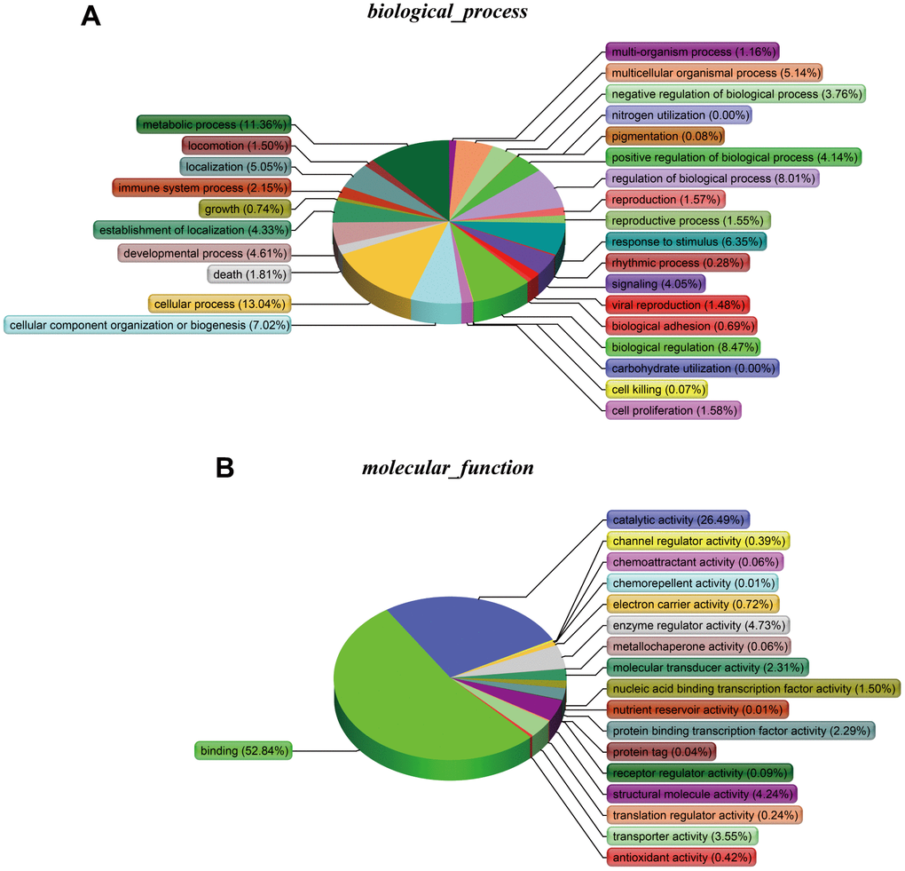 The cellular components (Figure 6B), biological processes (Figure 7A), and molecular functions (Figure 7B) were identified via PANTHER. Among the cellular components, the cell occupied the maximal portion with 18.8%, while the cell part ranked second at 18.79%. Among the biological processes, cellular processes accounted for the largest proportion (13.04%), followed by metabolic processes (11.36%). The molecular function analysis involved mainly binding (52.84%) and catalytic activity (26.49%).