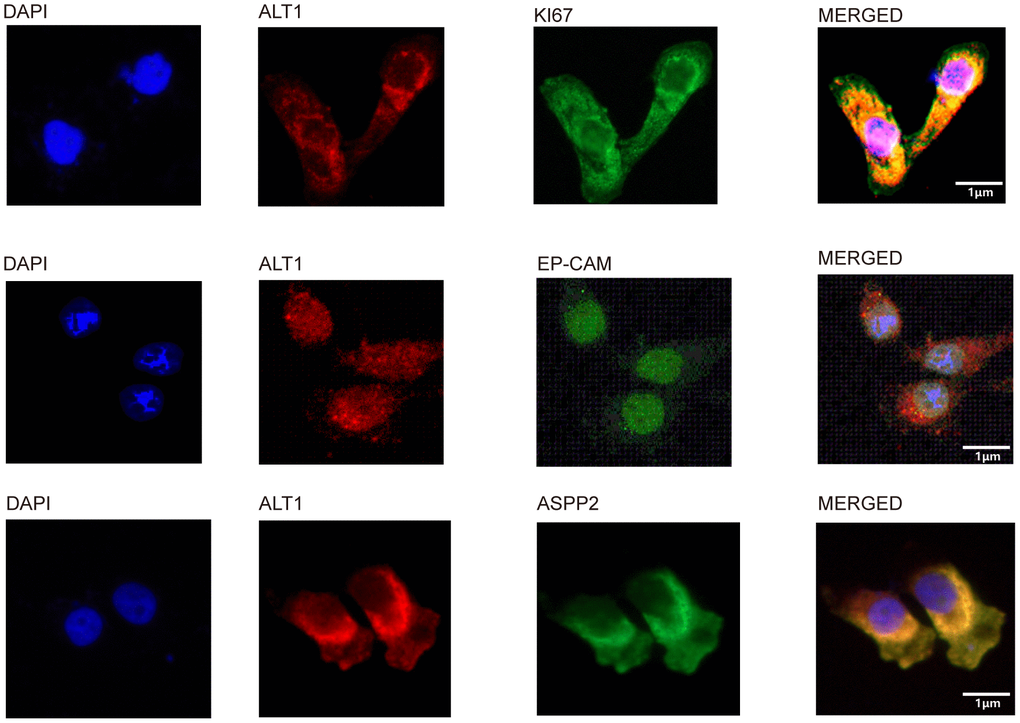 Three main DEPs were selected for evaluation further. EP-CAM, KI67, and ASPP2 were captured by co-IP with ALT1 used as a bait protein, indicating a direct interaction between ALT1 and these three DEPs. (Figure 8C) Knockdown of EP-CAM and KI67 decreased the expression of ALT1, while knockdown of ASPP2 increased ALT1 expression. (Figure 8D). Confocal microscopy was used to determine the subcellular co-location of these three key DEPs with ALT1 (Figure 9).