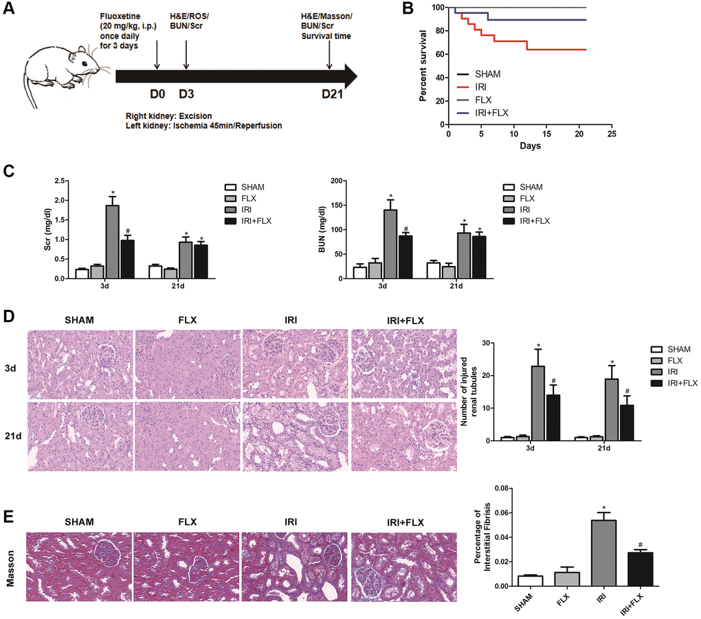 As shown in Figure 1A, the renal IRI rat model was established, and the relevant detection indexes were collected at corresponding time. Compared to SHAM group, FLX group and IRI+FLX group, the survival rate of these rats significantly decreased (P < 0.05, Figure 1B); and the levels of BUN and Scr at 3 days after operation significantly increased in IRI intervention group (P < 0.05, Figure 1C). In addition, renal IRI resulted into the renal tubule cell atrophy and dilatation of rats (P < 0.05; Figure 1D). Next, we prolonged the experiment time, and further observed the improved tubular injury as well as interstitial fibrosis on 21 days after renal IRI by Masson staining. We found that the ischemia of the kidney could cause in situ loss of parenchymal cells (P < 0.05; Figure 1E). The above results showed that FLX administration could protect these rats from renal IRI and subsequent early fibrotic injury.
