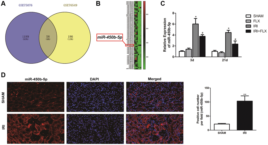 After a series of data pre-processing steps from the gene expression matrices GSE75076 and GSE76549 based on the Gene Expression Omnibus (GEO) dataset, the results combined the gene expression matrices were analysed to find a total of the differentially expressed miRNAs in renal tissues caused by IRI of rats (Figure 3A). As shown in Figure 3B, the heat map indicated that the expression difference of miR-450b-5p was the largest, which was selected as the target miRNA. The expression level of miR-450b-5p significantly increased in IRI group, compared to SHAM group. Meanwhile, FLX could significantly decrease the expression level of miR-450b-5p in renal IRI-induced oxidative damage (P < 0.05) (Figure 3C). According to FISH results shown in Figure 3D, compared to that of SHAM group, the expression level of miR-450b-5p also significantly increased in renal tissues of IRI group.