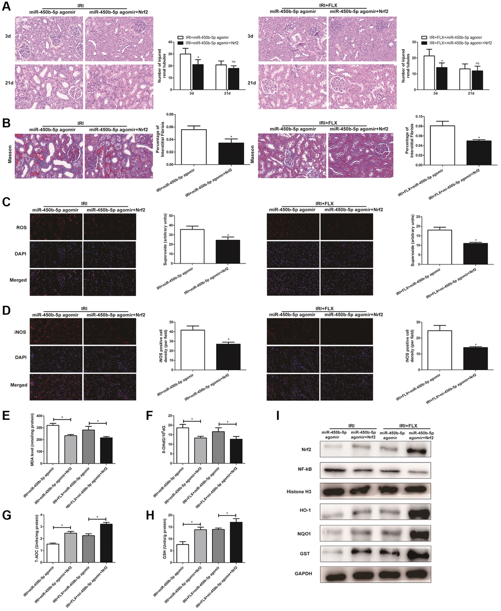 H&E staining showed that miR-450b-5p agomir+Recombinant Nrf2 injection significantly relieved the histological alterations in renal IRI rats with miR-450b-5p agomir injection (Figure 6A). Moreover, Masson staining showed that the fibrotic collagen deposition were significantly decreased in miR-450b-5p agomir+Recombinant Nrf2 group, relative to miR-450b-5p agomir group; Besides, the intervention of FLX also significantly decreased the fibrotic collagen deposition, compared with IRI rats (Figure 6B, P < 0.05). In addition, ROS staining showed that miR-450b-5p agomir+Recombinant Nrf2 could decrease the intensity of the fluorescent signals, compared to miR-450b-5p agomir group, whether in IRI group or IRI+FLX group (Figure 6C). Immunohistochemical analysis also showed that, miR-450b-5p agomir+Recombinant Nrf2 could decreased the expression level of iNOS, compared to miR-450b-5p agomir group (Figure 6D). In addition, We found that the content of MDA (Figure 6E) and 8- OHdG (Figure 6F) significantly decreased, but the content of antioxidants, including T-AOC (Figure 6G) and GSH (Figure 6H), just significantly increased in miR-450b-5p agomir+Recombinant Nrf2 group, compared with miR-450b-5p agomir group following reperfusion, whether in IRI group or IRI+FLX group. As shown in Western Blot assay, the expression levels of Nrf2 and Nrf2-dependent antioxidant enzymes, including HO-1, NQO1 and GST, significantly increased in miR-450b-5p agomir+Recombinant Nrf2 group, compared to miR-450b-5p agomir group following reperfusion, whether in IRI group or IRI+FLX group (Figure 6F). Thus, these results suggested that the pretreatment of FLX might promote antioxidant ability by decreasing the recruitment of miR-450b-5p/Nrf2 axis in renal IRI-treated rats.
