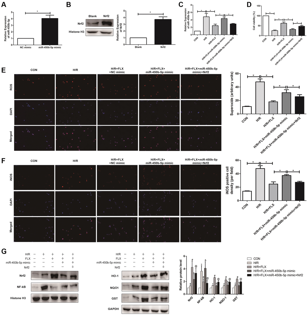 To further analysis, miR-450b-5p mimic was established in HK-2 cells, and qRT-PCR assay verified the transfection efficiency (Figure 7A). In addition, Western Blot assay showed that the expression level of Nrf2 significantly increased after the administration with 10 nmol recombinant protein Nrf2 in human HK-2 cells (Figure 7B). As shown in Figure 7C, qRT-PCR assay showed that recombinant protein Nrf2 could decrease the expression level of miR-450b-5p, to reverse the oxidative stress induced by HK-2 cells H/R model, in H/R+FLX group. In addition, the results found that miR-450b-5p mimic significantly decreased the cell viability; However, miR-450b-5p mimic+Recombinant Nrf2 dramatically increase the cell viability, compared with miR-450b-5p mimic (Figure 7D). As shown in Figure 7E, immunofluorescence assays showed that the intracellular ROS in FLX pretreatment group was significantly lower than H/R group. In contrast, miR-450b-5p mimic+Recombinant Nrf2 could significantly decrease the excessive generation of ROS compared to miR-450b-5p mimic. Immunohistochemical analysis of iNOS also reflected this trend (Figure 7F).