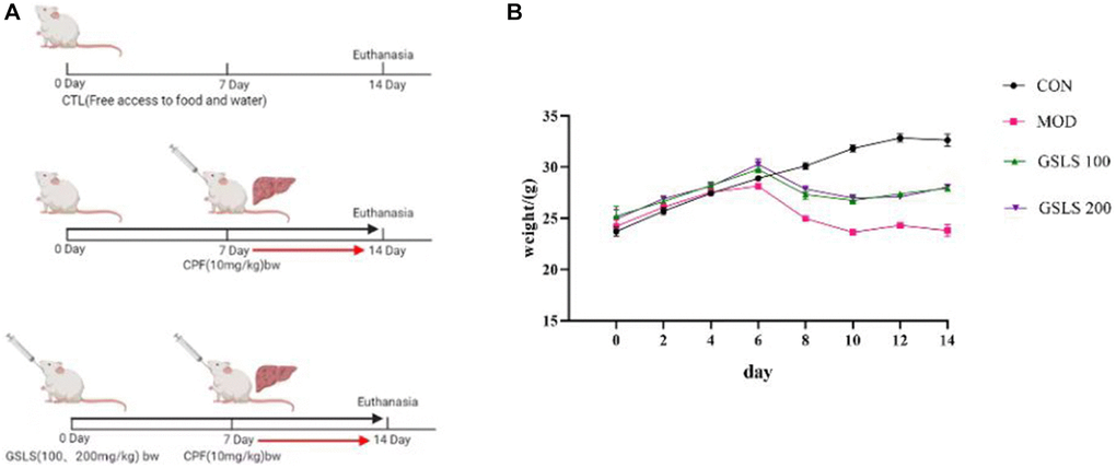As presented in Figure 1B, before modeling, the mice lived normally, with shiny color, normal eating and drinking, and a significant weight gain trend. The body weight of mice was measured 1 hour before oral CPF modeling, and there existed no significant difference in body weight among all groups. Mice were preprotected with 100 mg/kg and 200 mg/kg GSLS by intragastric administration. In addition, CPF oral modeling was performed on the seventh day. In addition to the control group, the mice in the rest of the groups were characterized by slow but less eating, at first, hair that was scattered and lost its luster, and weight that dropped significantly. However, when the mice in the GSLS protection group were given the action back, eating normal gradually, weight gradually recovered to steady growth.