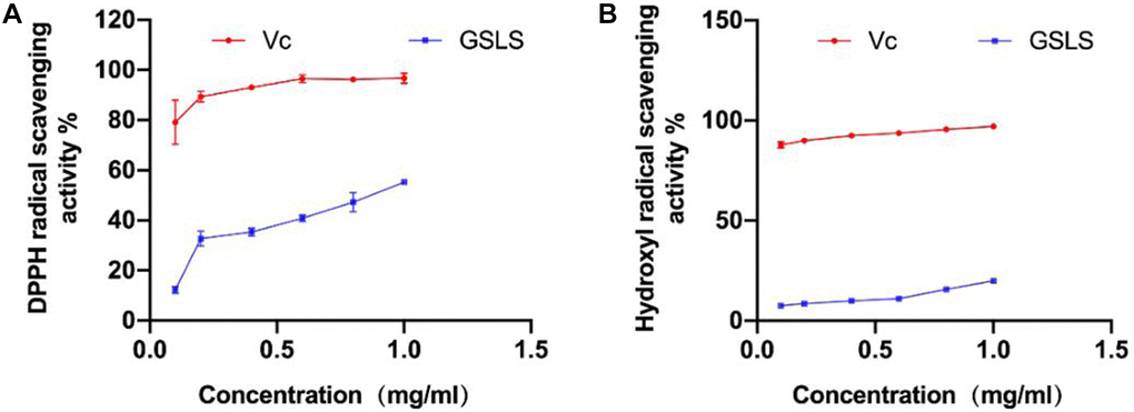 As shown in Figure 2B, hydroxyl radical can be cleared by GSLS, and the clearance rate of GSLS on hydroxyl radical increases in a curve. When the concentration of GSLS increases from 0.6 mg/ml to 1 mg/ml, the clearance rate increases from 10.33% to 20.46%. It can be observed that GSLS has certain scavenging ability on hydroxyl radical.