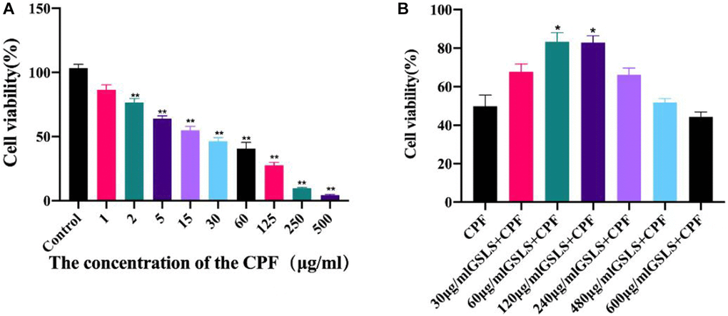 L02 cells with normal activity were inoculated into 96-well culture plates and cultured with 1 × 106 cells/well for 8 h. After cell adhesion, different concentrations of GSLS (0, 30, 60, 120, 240, 480, 600 μg/mL) were added for pre-protection for 12 hours to determine the optimal inhibitory concentration of GSLS. Then, cells were treated with 2 ug/ml CPF in a 96-well plate for 2 hours. Finally, 10 μL CCK-8 reagent was added to each well. After 2 hours, the absorbance of the plate was measured at 450 nm with a microplate reader at 37°C.