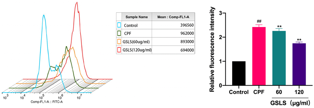 CPF-treated L02 cells produced more DCF signal than the control group. The experimental data were processed using image J software. Notably, there existed a significant increase in reactive oxygen species (ROS) produced by CPF exposure compared to the control group (P < 0.05). Preprotection with GSLS significantly reduced intracellular ROS level, and fluorescence intensity was significantly lower than CPF group (P < 0.05). The results suggest that GSLS effectively inhibits cpF-induced intracellular ROS production.