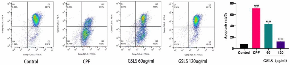 We examined mitochondrial membrane potential to elucidate the mechanism by which CPF exposure induces apoptosis. JC-1 was used as an indicator of Δψm to explore mitochondrial depolarization. As shown in Figure 5, flow cytometry analysis results showed that CPF exposure significantly reduced the red/green fluorescence ratio, indicating that Δψm decreased and mitochondrial depolarization induced apoptosis. Obviously, the red/green fluorescence ratio recovered significantly compared with the GSLS pre-protected group. These results indicated that GSLS saved Δψm, and GSLS could lower mitochondrial dysfunction and effectively inhibit apoptosis induced by CPF exposure.