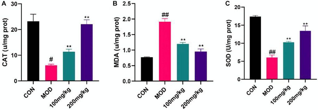As displayed in Figure 6, MDA level of CPF-induced liver injury mice increased significantly, indicating that CPF tissue degenerated and serum SOD and CAT levels decreased. The level of MDA in 100 mg/kg GSLS preprotection group increased whereas SOD and CAT levels recovered. Compared with the control group, the levels of MDA, SOD and CAT in mice pretreated with 200 mg/kg GSLS did not change significantly, proving that GSLS generated a certain alleviating effect on liver injury caused by CPF, and 200 mg/kg GSLS had the best preprotective effect.