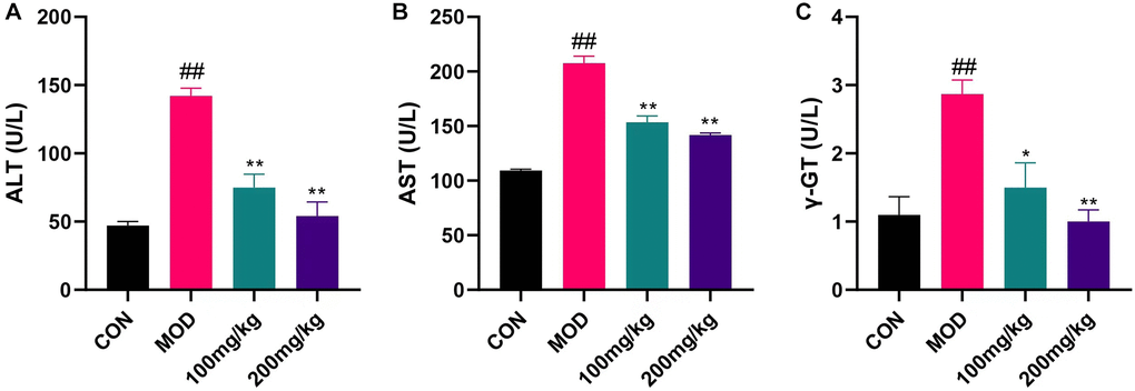 Mice liver serum was centrifuged at 4°C, and supernatant was taken after centrifugation at 2500 r/min for 10 min. The levels of ALT, AST and TG in mouse serum were detected by automatic biochemical analyzer. The levels of ALT [30], AST [31] and γGT [32] in serum were determined by colorimetric spectrophotometer.