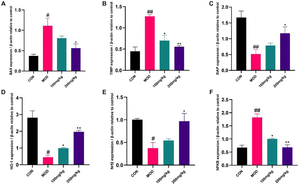 GSLS can affect apoptosis, liver fibrosis and anti-apoptotic markers. In CPF group, apoptotic gene Bax and liver fibrosis gene TIMP were increased, while anti-apoptotic gene XIAP was decreased (Figure 8A and 8B). On the contrary, the expression of Bax and TIMP was down-regulated and the expression of XIAP was up-regulated in 100 mg/kg GSLS group. However, the expression of Bax and TIMP was down-regulated and XIAP was up-regulated in 200 mg/kg GSLS group. Compared with the control group and the GSLS pre-protected group (CPF+GSLS 100 group and CPF+GSLS 200 group), the mRNA expression of Nrf-2 and HO-1 in the CPF group was down-regulated (Figure 8C and 8D), and the mRNA expression of NFkB was up-regulated (Figure 8E). Oxidative stress was shown to occur in CPF group. In the GSLS preprotected group, liver antioxidant activity appeared to recover and NFkB expression was upregulated to normal levels (Figure 8F).