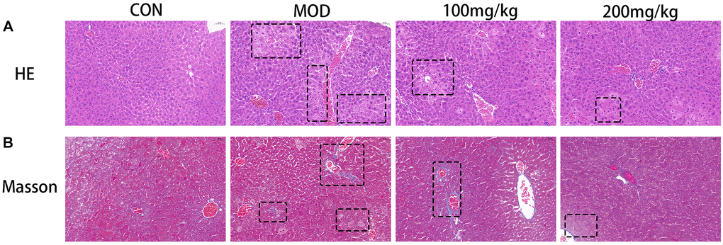 Sections of liver tissue were taken from the same part of liver lobe, fixed at 25°C with 4% buffered formalin for 24 h, embedded in paraffin, and cut into 4 μm thick sections. We performed histopathological analysis of liver slices to investigate liver morphology (hemoxysin and eosin staining) and tissue damage/liver fibrosis (Mason’s trichromatic staining). Histopathological changes were observed under light microscope.