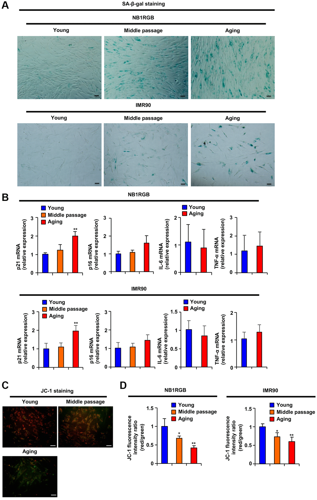 NB1RGB and IMR90 cells, which are human diploid fibroblasts (HDFs), at different stages of proliferative and replicative aging showed several aging-related markers, such as Senescence associated-β-galactosidase (SA-β-gal) and genetic markers (DNA damage signal: p21 and p16, SASP factors: IL-6 and TNF-α), as shown in Figure 1A and 1B. Previously, p21 expression and SA-β-gal activity were reported to be increased in early senescence, and p16 and SASP factor gene expression was found to be induced in late senescence [14]. As shown in Figure 1A and 1B, aging fibroblasts exhibited SA-β-gal activity and increased p21 mRNA levels, but p16, IL-6 and TNF-α mRNA expression was no different than that in young fibroblasts, indicating that our established aging fibroblasts were in the early stage of senescence but not fully senescent. Mitochondrial transmembrane potential (ΔΨm) reflects mitochondrial function. We analyzed the effect of these HDFs on ΔΨm using the fluorescent probe JC-1. Red fluorescence shows JC-1 aggregates that appear in the mitochondria after potential-dependent aggregation. Green fluorescence shows JC-1 monomers that appear in the cytosol after mitochondrial membrane depolarization. Aging and middle-passage fibroblasts exhibited decreased ΔΨm, as demonstrated by analysis with fluorescence microscopy (Figure 1C) and microplate reader (Figure 1D). These results suggested that mitochondrial dysfunction and increased SA-β-gal activity were induced earlier than the upregulation of p21 mRNA expression and that aging fibroblasts were in the early phase of cellular senescence.