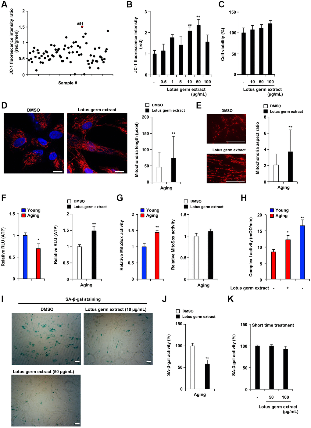 Several reports have suggested that mitochondrial dysfunction stimulates cellular senescence [7, 8]. Our results indicated that mitochondrial dysfunction occurred earlier than the induction of DNA damage signaling and SASP-related gene expression in the proliferative and replicative senescence steps, suggesting that reactivation of mitochondrial function suppressed the progression of cellular senescence in the early stage. We then screened 75 plant extracts (Table 1) to identify those that increase the ΔΨm. As shown in Figure 2A, among these, lotus germ extract (#51) increased the ΔΨm the most in aging fibroblasts, and this increase was dose-dependent without the induction of cell death (Figure 2B, 2C, Supplementary Figures 1A, 1B and 2A upper panel). We confirmed the measurement of ΔΨm activity using a different method as TMRM staining, and we analyzed the dye distribution between mitochondria and the nucleus. As shown in Supplementary Figure 2A (under panel) and Supplementary Figure 2B, the results of the fluorescence image of TMRM staining and the analysis of the distribution of the TMRM fluorescence intensity suggested that lotus germ extract increased TMRM fluorescence intensity. Such an increase was dose-dependent in aging fibroblasts. The analysis result of TMRM fluorescence intensity between mitochondria and the nucleus and microplate reader was very similar (Supplementary Figure 2B and 2C). Thus, we also used microplate reader analysis following TMRM experiments. Lotus germ extract has several bioactive effects, such as its effects against cancer and obesity; however, the effect of lotus germ extract on mitochondrial function has not been elucidated [15]. Previously, it was reported that cycles of fusion and fission modify the morphology of the mitochondrial compartment. Fragmented, short mitochondria (low aspect ratio) have low respiratory activity than fused, long mitochondria (high aspect ratio) [16]. As shown in Figure 2D, we performed imaging analyses using MitoTracker to visualize the mitochondrial morphology, which indicated many short mitochondrial forms in the aging cells (DMSO); however, treatment with lotus germ extract increased the abundance of the long form. The lotus germ extract treatment also increased the aspect ratio of mitochondria in aging fibroblast cells (Figure 2E). ATP production is related to mitochondrial function. A luciferase assay revealed that ATP production was decreased in aging fibroblasts compared to young fibroblasts. The treatment with lotus germ extract significantly increased ATP in aging fibroblasts (Figure 2F and Supplementary Figure 1C). On the other hand, ROS production increased in our established aging fibroblasts compared to young fibroblasts. The lotus germ extract did not increase mitochondrial ROS production in aging fibroblasts, as shown with MitoSOX imaging (Figure 2G). These results suggested that lotus germ extract reactivates mitochondrial function without inducing ROS production. We examined mitochondrial complex I—reduced form of nicotinamide adenine dinucleotide (NADH) dehydrogenase activity—which was measured via spectrophotometric assessment. We found that aging fibroblasts suppressed mitochondrial complex I activity compared young fibroblasts and that lotus germ extract stimulated mitochondrial complex I activity in aging fibroblasts (Figure 2H).