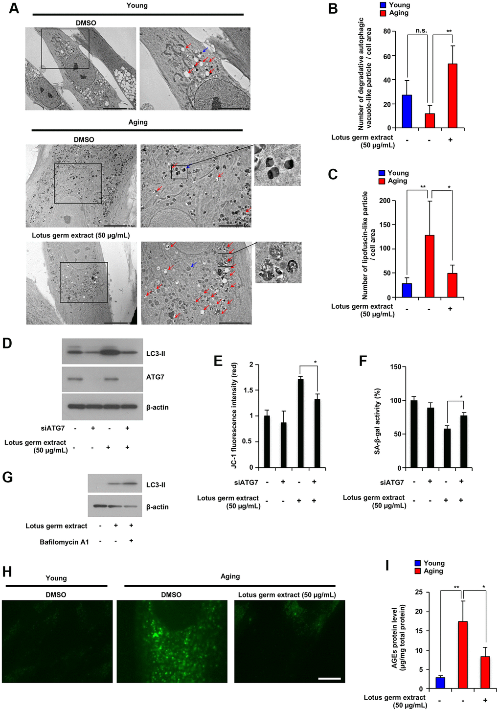 Several reports indicated that lipofuscin is a fluorescent complex mixture composed of highly oxidized cross-linked protein residues, lipids, and sugars, and increased in senescent cells, and age-related lipofuscin aggregates included AGEs, which have also autofluorescence [20]. As shown in Figure 3A and 3C, lotus germ extract decreased age-related lipofuscin-like particles incorporated into autolysosomes. Thus, we confirmed whether autofluorescence and AGE protein levels would be increased in aging fibroblasts and decreased by lotus germ extract treatment. As shown in Figure 3H and 3I, autofluorescence and AGE protein levels increased in aging fibroblasts compared to young fibroblasts, which supported aging fibroblasts, including lipofuscin-like particles in Figure 3A, and treatment with lotus germ extract decreased autofluorescence and AGE protein levels in aging fibroblasts. Therefore, lotus germ extract treatment could restore age-dependent disrupted protein homeostasis in aging cells.