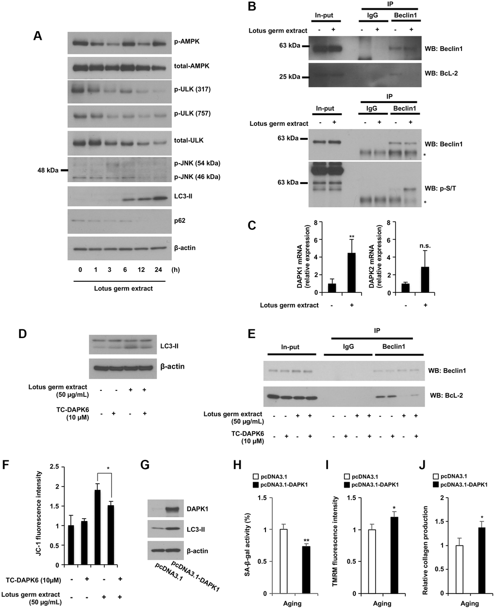 Beclin1 plays a central role during the autophagy process [22]. Under normal conditions, Bcl-2 binds Beclin1 and inhibits autophagosome formation; however, the phosphorylation of Beclin1 releases it from Bcl-2, and Beclin1 can then carry out its function in autophagy [23]. Therefore, we tested whether lotus germ extract affects the binding of Beclin1 and Bcl-2 and the phosphorylation of Beclin1. Immunoprecipitation showed that Beclin1 did not bind Bcl-2, and Beclin1 was phosphorylated under lotus germ extract treatment (Figure 4B). We confirmed whether the lotus germ extract affects Beclin1 expression level. As shown in Supplementary Figure 2F, the lotus germ extract did not affect the Beclin1 mRNA expression level, and the Beclin1 protein expression level showed almost no change (Figure 4B; shown input lanes). The phosphorylation of JNK was detected at only 3 h; thus, we aimed to identify other factors involved in Beclin1 phosphorylation. Death-associated protein kinase 1 (DAPK1) expression was induced by lotus germ extract, but DAPK2 expression was not (Figure 4C). DAPK1 promotes noncanonical autophagy via the phosphorylation of Beclin1 [24], and we determined whether the induction of DAPK1 expression is involved in lotus germ extract-induced autophagy. Treatment with a DAPK1 inhibitor (TC-DAPK6) suppressed lotus germ extract-induced upregulation of LC3-II expression and disintegration of the Beclin1 and Bcl-2 complex in aging fibroblasts (Figure 4D and 4E). Furthermore, inhibition of DAPK1 activity suppressed the reactivation of mitochondrial function in aging fibroblasts (Figure 4F). We demonstrated the effect of overexpression of DAPK1 for several aging phenotypes. As shown in Figure 4G–4J, the overexpression of DAPK1 induced the LC3-II expression, inhibited SA-β-gal activity, and stimulated mitochondrial ΔΨm and collagen production. These results indicated that the effect of the DAPK1 upregulation expression was similar to the lotus germ extract-induced antiaging effect in aging fibroblasts, suggesting that the induction of DAPK1 is a crucial signal induction for the antiaging effect of the lotus germ extract. The data shown in Figure 4 indicate that the lotus germ extract induces autophagy via the DAPK1-Beclin1 pathway, a noncanonical autophagy pathway.