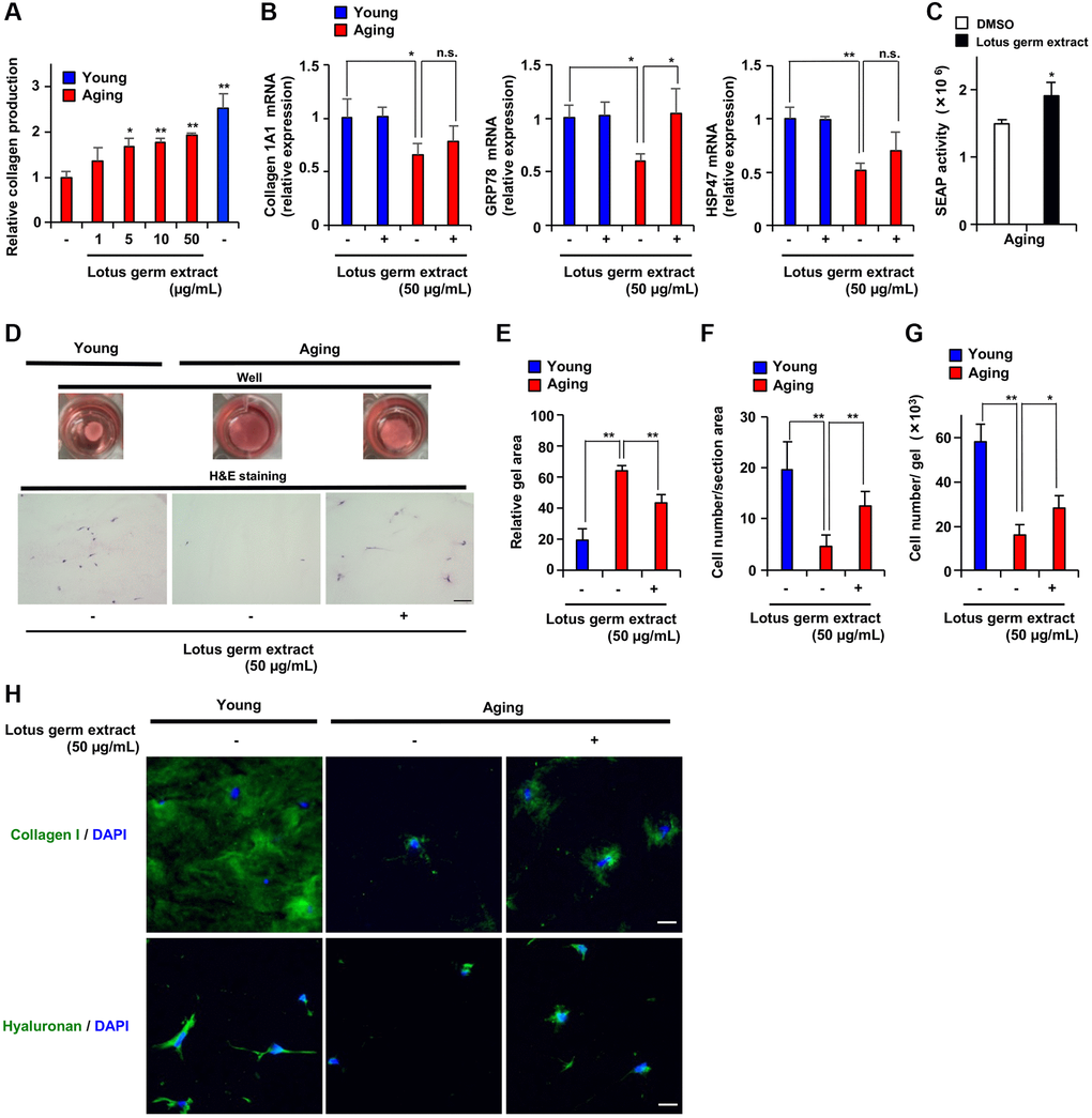The amount of collagen production regulates both collagen mRNA expression and protein folding capacity in the endoplasmic reticulum (ER), which involves ER chaperones such as GRP78 and HSP47. Treatment with lotus germ extract did not change collagen 1A1 or HSP47 mRNA expression but increased GRP78 mRNA expression in aging fibroblasts, suggesting that ER protein folding capacity might have been increased by lotus germ extract (Figure 6B). We next investigated the effect of lotus germ extract on the secretory output of the ER using the secreted alkaline phosphatase (SEAP) assay [31]. We expressed SEAP in aging fibroblasts and monitored its secretion. Lotus germ extract significantly enhanced the secretion of SEAP (Figure 6C), suggesting that the stimulation of collagen production depends on enhanced secretory function of the ER and was enhanced by lotus germ extract.