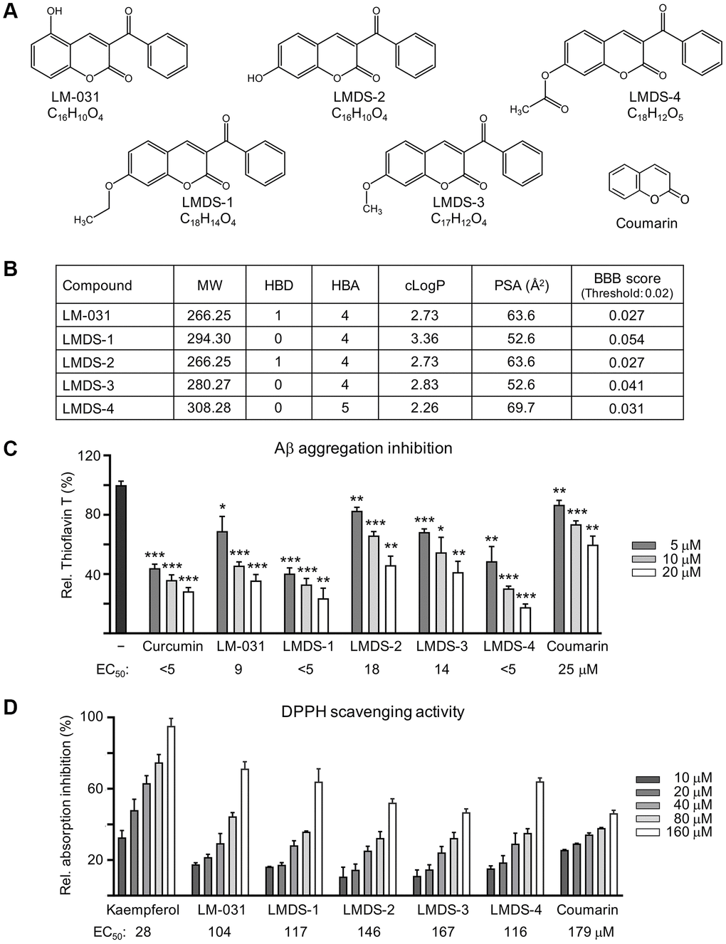 Anti-amyloid and anti-oxidative stress are regarded as crucial AD therapeutic approaches. The thioflavin T fluorescence assay was applied to gauge the suppression of Aβ aggregation. Curcumin is known to reduce amyloid aggregation [27]. Both curcumin and coumarin were included for comparison. Half maximal effective concentration (EC50) values of curcumin, LM-031, LMDS-1 to -4 and coumarin to inhibit Aβ aggregation were: <5, 9, <5, 18, 14, <5 and 25 μM, respectively (Figure 1C). The free radical scavenging activity of the LM-031, analogs and coumarin was investigated using diphenylpicrylhydrazyl (DPPH) as a substrate. Kaempferol (a positive control [28]), LM-031, LMDS-1 to -4 and coumarin had EC50 values of 28, 104, 117, 146, 167, 116 and 179 μM, respectively (Figure 1D).