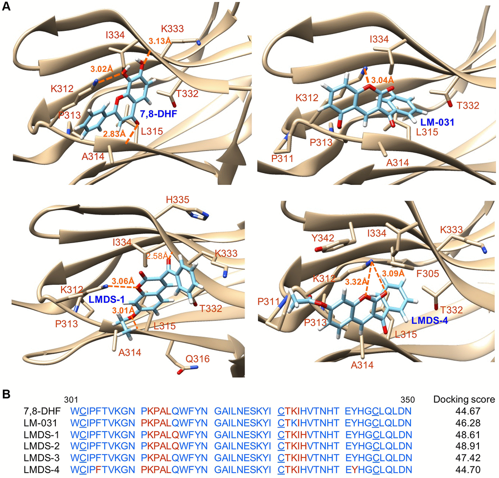 Figure 2A shows the binding conformations of 7,8-DHF, LM-031 and two representative LMDS compounds (LMDS-1 and -4) and Figure 2B shows the predicted binding strengths of these compounds. Of the tested compounds, the computations predicted that LMDS-1 and -2 were the top two compounds interacting with TRKB receptor. Note that the LMDS compounds have different binding modes in comparison with 7,8-DHF and LM-031. In addition, interestingly, all LMDS-1 to -3 have the same binding mode, 3 hydrogen bonds with backbone of L315 and I334, and side chain of K312. In contrast, LMDS-4 binds with d5 domain in different orientation with a lower binding strength compared with LMDS-1 to -3. It only has a bifurcated hydrogen bond with side chain of K312. These results suggest that bulky carboxylate group is not favorable functional group at the position of fused ring of LMDS compounds shown in Figure 1A.