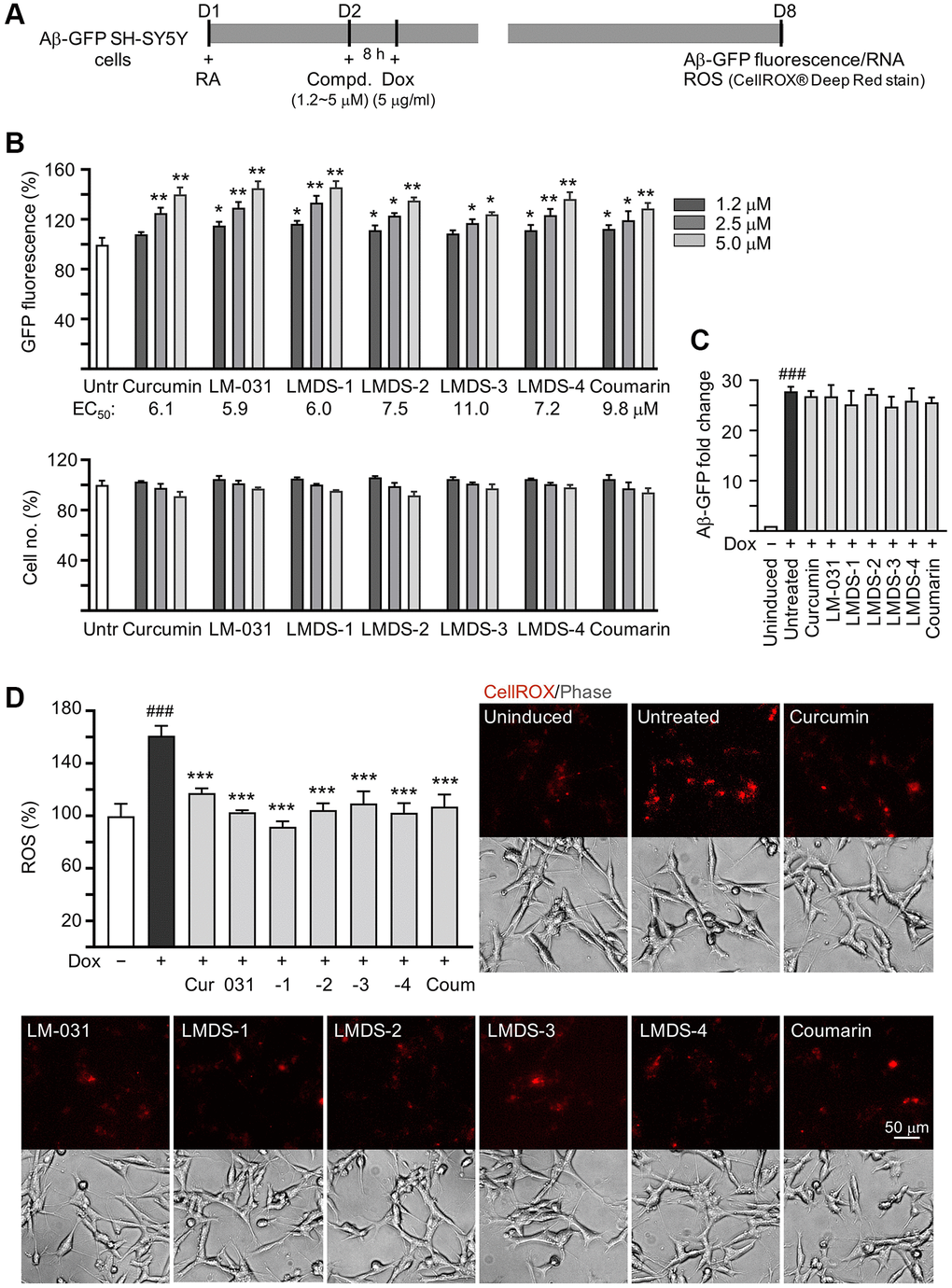 Neuronal differentiation of Aβ-GFP SH-SY5Y cells was induced by retinoic acid (10 μM; Sigma-Aldrich) [68]. Cells on 96-well plate (2.5 × 104/well) were seeded on day 1, pre-treated with test compounds (1.2–5 μM) plus induced Aβ-GFP expression (5 μg/ml doxycycline) on day 2, and stained with Hoechst 33342 (0.1 μg/ml; Sigma-Aldrich) on day 8 as stated [60]. Cell images were then captured at 482 nm excitation/536 nm emission wavelengths (ImageXpress Micro Confocal high-content system) and analyzed (MetaXpress image acquisition and analysis software) (Molecular Devices, Sunnyvale, CA, USA). In addition, ROS was quantified on day 8 following CellROX Deep Red stain (5 μM; Molecular Probes, Waltham, MA, USA) using the high-content system with excitation/emission wavelengths of 644/665 nm.