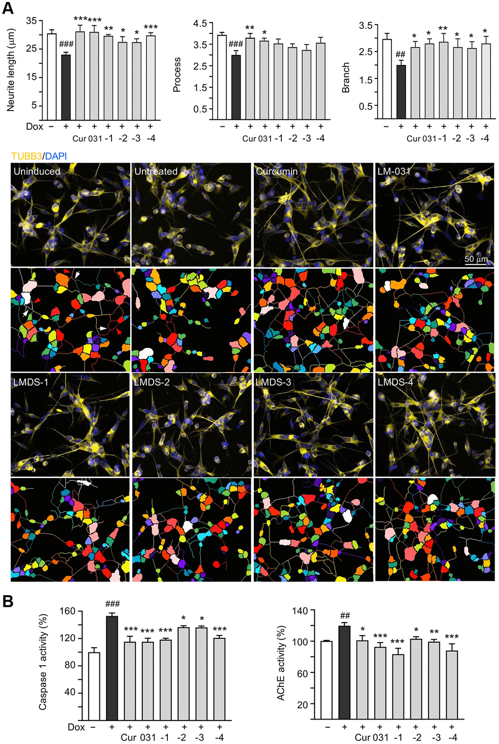 The neuroprotective efficacy of LM-031 and analogs, including acetylcholinesterase (AChE) and caspase 1 activity, and neurite outgrowth, were evaluated. Aβ overexpression significantly reduced length (from 30.6 μm to 23.1 μm, P = 0.002), process (from 3.9 to 3.0, P = 0.005) and branch (from 3.0 to 2.0, P = 0.002) of neurites. Respective curcumin, LM-031 or analogs (5 μM) treatment successfully increased neurite length (from 23.1 μm to 27.5–31.2 μm, P = 0.036–<0.001) and branch (from 2.0 to 2.7–2.9, P = 0.047–0.006), while rescue of process was evident only for curcumin and LM-031 (from 3.0 to 3.7–3.8, P = 0.011–0.002) (Figure 4A). AChE (120%, P = 0.007) and caspase 1 (153%, P < 0.001) activities were also considerably elevated by Aβ overexpression, whereas treatment with curcumin, LM-031 and analogs (5 μM) decreased AChE (from 120% to 103–83%; P = 0.027–<0.001) and caspase 1 (from 153% to 137–115%; P = 0.014–<0.001) activities in comparison to no treatment (Figure 4B).