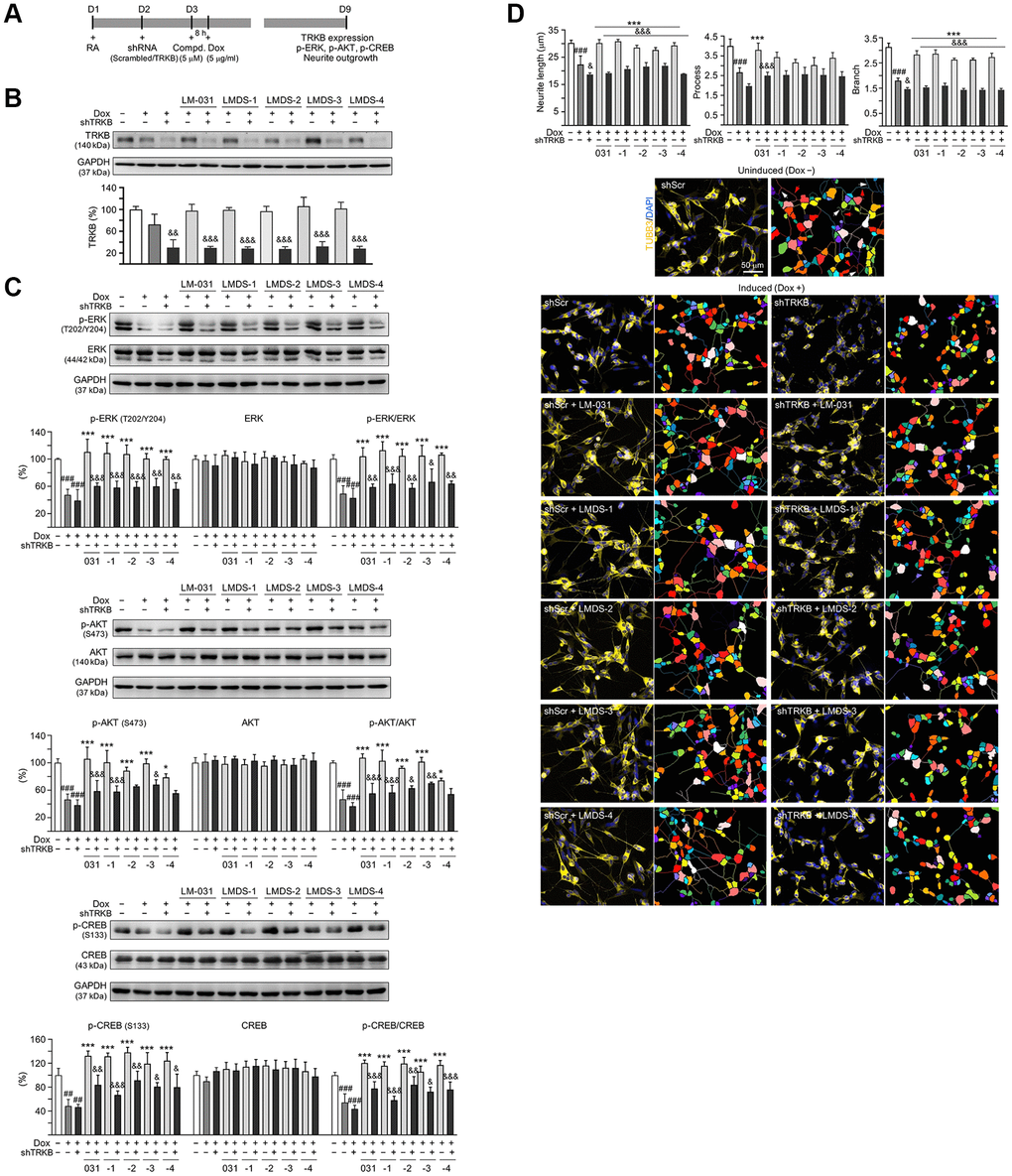 To knock down TRKB expression in Aβ-GFP SH-SY5Y cells, lentiviral short hairpin RNA (shRNA) targeting TRKB and control (scrambled) were used [69]. Cells were plated in the presence of retinoic acid (5 × 105/6-well for protein analysis or 6 × 104/24-well for neurite outgrowth analysis) on day 1, infected with lentivirus on day 2, pretreated with test compound (5 μM) plus inducing Aβ-GFP expression on day 3, and collected for neurite outgrowth or TRKB protein analysis on day 9 as stated [69].