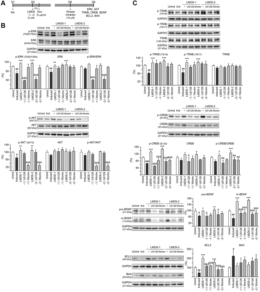 Cells were plated in the presence of retinoic acid (5 × 105/6-well) on day 1, treated with tested compounds (5 μM) plus induced Aβ-GFP expression with doxycycline (5μg/ml) on day 2, as stated. Kinase inhibitors U0126 (an inhibitor of ERK) or wortmannin (an inhibitor of PI3K) (LC Laboratories, Woburn, MA, USA) (10 μM) were added on day 6. The cells were collected on day 8 for BDNF, BCL2, BAX, total/phosphorylated TRKB, ERK, AKT, and CREB protein analysis as previously stated.