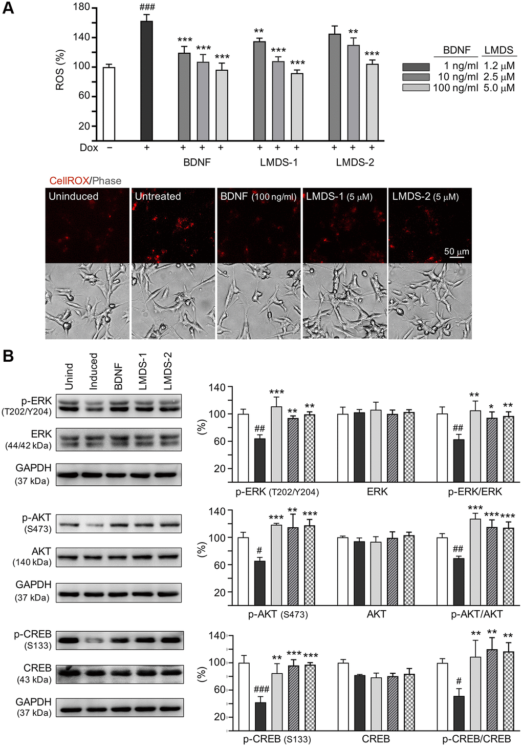 As LMDS-1 and -2 target ERK, AKT and downstream CREB, effects of BDNF and LMDS compounds on TRKB signaling were compared. Oxidative stress attenuation was first evaluated by treating Aβ-GFP cells with BDNF at 1–100 ng/ml concentration or LMDS-1, -2 at 1.2–5 μM concentration (Figure 7A). The ROS level induced by Aβ overexpression was successfully decreased by BDNF at 1–100 ng/ml, LMDS-1 at 1.2–5 μM, and LMDS-2 at 2.5–5 μM (from 163% to 135–92%, P = 0.007–<0.001). BDNF at 100 ng/ml and LMDS-1, -2 at 5 μM were then selected to compare the efficacy in TRKB signaling (Figure 7B). Overexpression of Aβ-GFP down-regulated p-ERK (64%, P = 0.001), p-AKT (65%, P = 0.014) and p-CREB (42%, P < 0.001), and BDNF, LMDS-1 and -2 treatment rescued the reduction (p-ERK: 94–111%, P = 0.005–<0.001; p-AKT: 115–118%, P = 0.001–<0.001; p-CREB: 85–97%, P = 0.002–<0.001). No significant differences in p-ERK, p-AKT and p-CREB were detected between BDNF and LMDS-1/2 groups (P > 0.05).