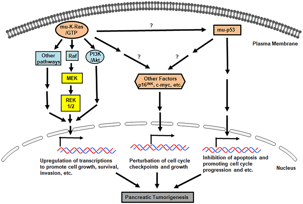 Mutations in K-ras prohibit its encoded onco-protein to associate with and further be inhibited by GTPase-activating proteins (GAPs), leading to mutant Ras staying in a persistently or constitutively active status. As the result, multiple downstream effector pathways of Ras, such as Raf/ERK1/2/MEK or PI3K/Akt, are activated for promoting uncontrollable cell growth, desensitizing cell death, remodeling cellular metabolism, escaping from immune surveillance and increasing cell invasion. Studies showed that pancreatic tumor cells can be shed and further circulate in the blood stream. Therefore, mutant K-ras can be detected in circulating tumor cells, which has been used to facilitate clinical diagnostic imaging analyses [33].