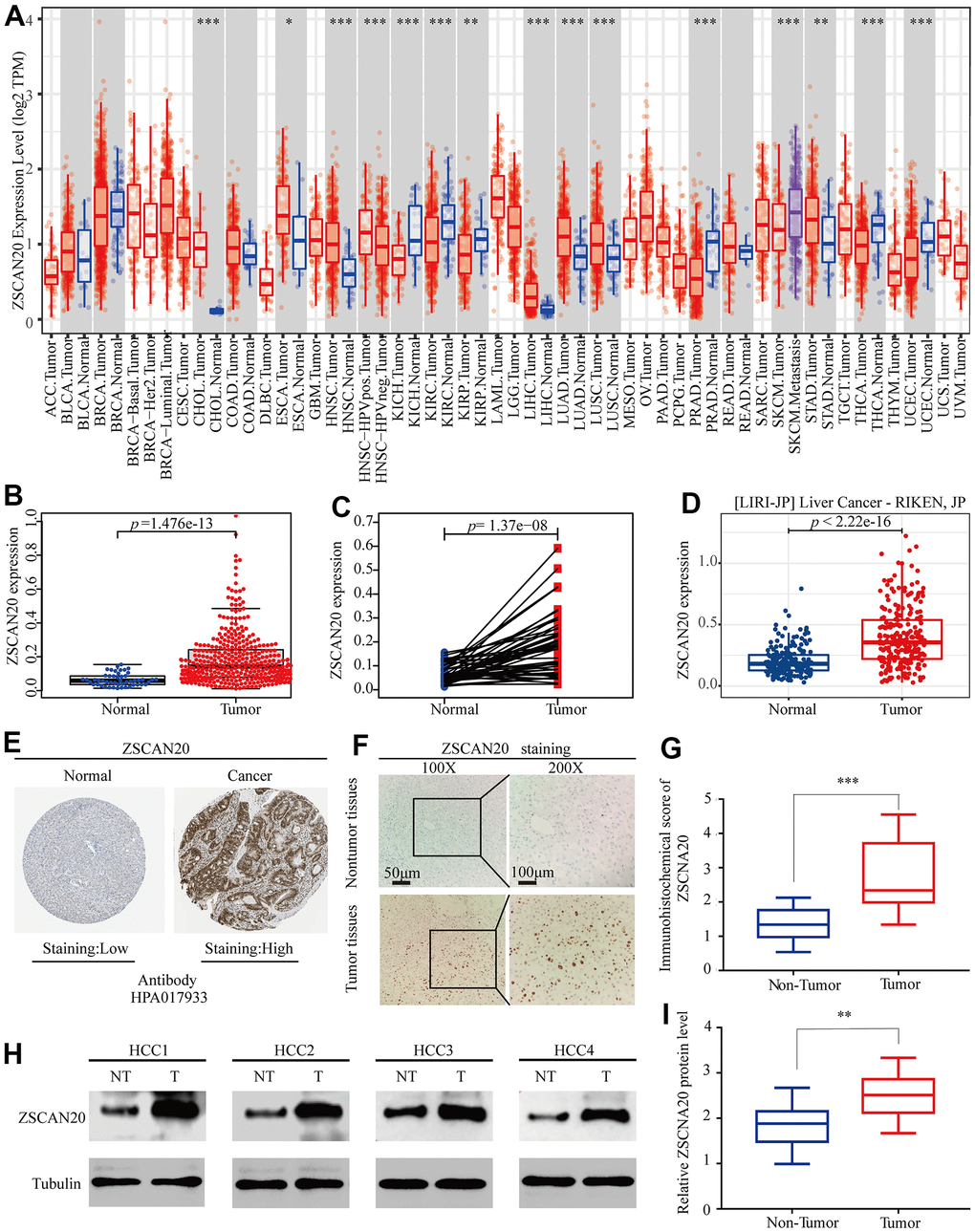 Expression of ZSCAN20 in HCC. (A) The expression level of ZSCAN20 in different types of tumor tissues and normal tissues in the TIMER database (P < 0.05). (B) Expression levels of ZSCAN20 were higher than corresponding normal tissues in LIHC samples (TCGA-LIHC) (p=1.476e-13). (C) ZSCAN20 expression in 50 paired LIHC tissues and corresponding adjacent non-tumor tissues (TCGA-LIHC) (p=1.37e-08). (D) Expression levels of ZSCAN20 were higher than corresponding normal tissues in LIHC samples by using ICGC-LIRI-JP liver datasets. (E) ZSCAN20 protein expression in normal and LIHC tissues (HPA). (F) Typical images of immunohistochemistry (IHC) in 35 pairs of LIHC tissues showing the protein expression of ZSCAN20 in LIHC and adjacent non-tumor tissues. (G) Diagram of ZSCAN20 staining score in IHC staining. (H) The protein expression of ZSCAN20 in tumor tissues and adjacent normal tissues was detected by Western Blot, and the coloring depth represented the level of protein expression. (I) Quantification of ZSCAN20 protein expression based on western blot.