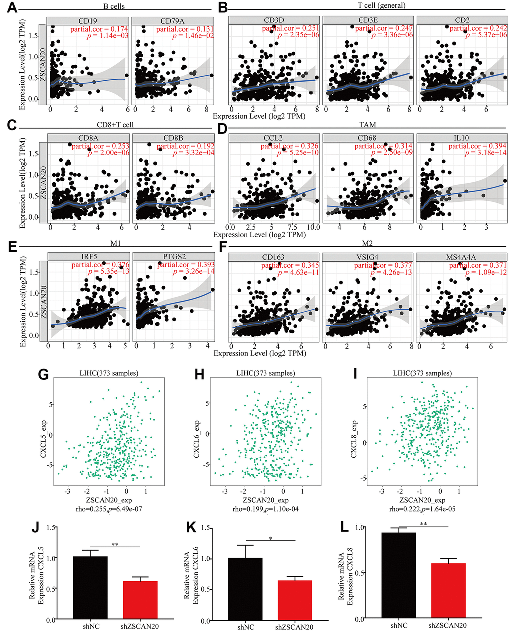 With the purpose of going deep on ZSCAN20 expression related to different markers of multiple immune cells. We made use of the TIMER database to further study the relation, and the genes listed in Table 2 and Figure 10A10F were used to characterize different immune cells. Tumor purity is a vital factor affecting clinical tumor biopsy immune infiltration anatomy. The expression of ZSCAN20 had a considerable positive correlation with the levels of most markers in distinguished kinds of LIHC immune cells after regulating tumor purity. In addition, we evaluated the link between ZSCAN20 and multiple T cell immune markers. We found that ZSCAN20 expression level was remarkably associated with 25 of the 26 T cell markers in LIHC after adjusting for tumor purity (Table 3). Moreover, ZSCAN20 was also closely linked to the LIHC-related chemokines including CXCL5, CXCL6 and CXCL8 (Figure 10G10I). Besides, we did the immune-related chemokines expression analysis in HCC cells. CXCL5, CXCL6 and CXCL8 were all down-regulated in ZSCAN20 shNC cells (Figure 10J10L). It could be known from the results that ZSCAN20 was positively associated with these chemokines.
