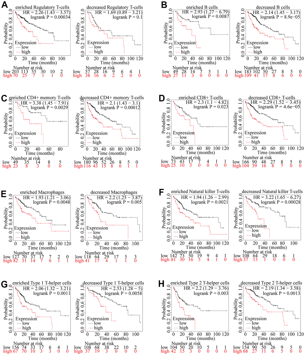 According to the results above, we have confirmed that the expression of ZSCAN20 was positively correlated with the infiltration of most immune cells in HCC, and the expression of ZSCAN20 was also associated with the poor prognosis of these tumors. Therefore, we speculated that part of the reason that ZSCAN20 expression affected the poor prognosis of HCC is immune infiltration. We performed a prognostic analysis of ZSCAN20 expression of patients in different immune cell subsets by Kaplan-Meier Plotter. We found that in enriched regulatory T cell cohorts, high expression of ZSCAN20 led to poor prognosis in HCC patients, but there was no significant association between low/high ZSCAN20 expression and HCC patient prognosis in decreased Regulatory T-cells cohorts (Figure 11A). Nonetheless, in other both enriched and decreased immune cell groups, it revealed that high expression of ZSCAN20 resulted in poor prognosis (Figure 11B11H). These results supported our speculation that high ZSCAN20 expression levels all contributed to the poor prognosis of HCC patients in part due to the level of regulatory T-cell immune infiltration. It is these consequences that show ZSCAN20 has a close association with the infiltration of HCC immune infiltrating cells, and may be associated with immune infiltration of regulatory T cells.