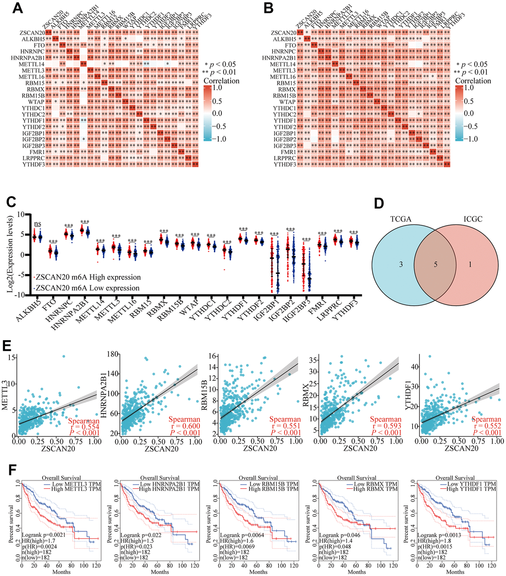 Correlations of ZSCAN20 expression with m6A related genes in HCC. (A, B) TCGA LIHC and ICGC data sets were used to analyze the correlation between the ZSCAN20 and the m6A related genes expression in LIHC. (C) Draw a scatter plot to show the correlation between the ZSCAN20 and the m6A related genes expression, including METTL3, HNRNPA2B1, RBM15B, RBMX and YTHDF1. (D) The differential expression of m6A related genes between high and low ZSCNA20 expression groups in LIHC tumor samples. (E) Venn diagram showed both expression correlation and differential expression of genes. (F) Kaplan-Meier curve of METTL3, HNRNPA2B1, RBM15B, RBMX, YTHDF1. *p < 0.05, **p < 0.01, ***p < 0.001, ****p < 0.0001. ns, not significant.