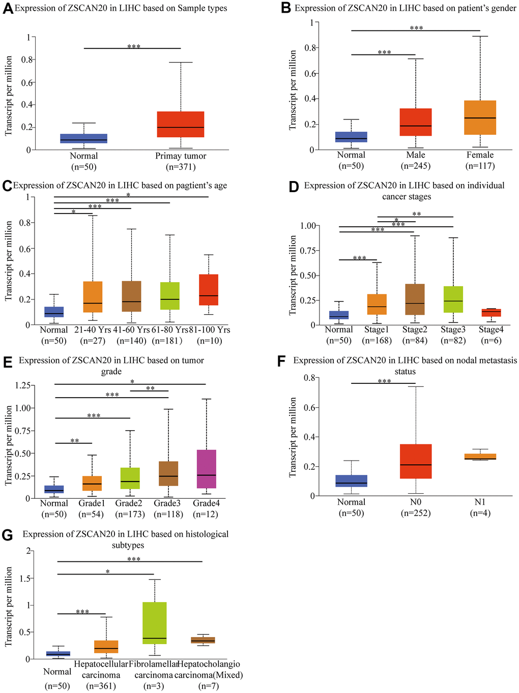 Because we are still uncertain about the role of ZSCAN20 in HCC, studying the correlation between ZSCAN20 expression and clinicopathological features would help us to uncover ZSCAN20’s function in the development of HCC. Consequently, we used the UALCAN online tool to investigate the expression of ZSCAN20 in the patient group based on different clinical parameters. The results showed that ZSCAN20 expressed significantly different in various HCC samples, gender, age, cancer stages, tumor grade, nodal metastasis status, histological subtypes (Figure 2A2G). We used logistic regression analysis to further study ZSCAN20 expression connected with clinicopathological variables. The results indicated the high expression of ZSCAN20 was obviously associated with grade, stage and tumor size (Supplementary Table 1). All results show that ZSCAN20 expression has a close connection with clinicopathological factors such as tumor progression and metastasis.