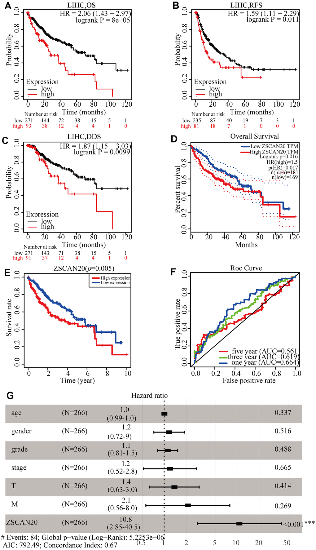 To understand the prognostic value of the expression of ZSCAN20 in HCC better, the Kaplan-Meier Plotter tool was used to detect the prognosis of ZSCAN20. Kaplan-Meier curve and log-rank test analysis showed that elevated ZSCAN20 mRNA levels correlated with overall survival (OS)(Figure 3A), relapse-free survival (RFS) (Figure 3B), and disease-specific survival (DSS) (Figure 3C). The consequence demonstrated that high ZSCAN20 expression corresponded to undesirable prognosis (OS, RFS, and DSS) in HCC patients (p < 0.05) (Figure 3A3C). We used the GEPIA and TCGA database to further verify the conjecture, and the results were consistent with the Kaplan-Meier Plotter tool (Figure 3D, 3E). Subsequently, the prediction accuracy of survival curve was determined by the construction of ROC curve. The graphics part below the ROC curve (AUC) for 1, 3, and 5 years were severally 0.664, 0.619, and 0.561. The result indicated favorable prediction accuracy (Figure 3F). In order to determine whether ZSCAN20 is an independent prognostic factor for HCC sufferers, we conducted the Cox regression analysis. Univariate Cox regression analysis showed that grade, T stage, and ZSCAN20 were noteworthy related to OS in patients with HCC. Multivariate Cox regression analysis revealed that ZSCAN20 was an independent factor affecting the prognosis in HCC (Table 1), also did forest plot (Figure 3G). The above results indicate that ZSCAN20 can be deemed to be an independent prognostic factor for the survival of HCC sufferers, and high expression of ZSCAN20 corresponds with the poor prognosis of HCC patients.