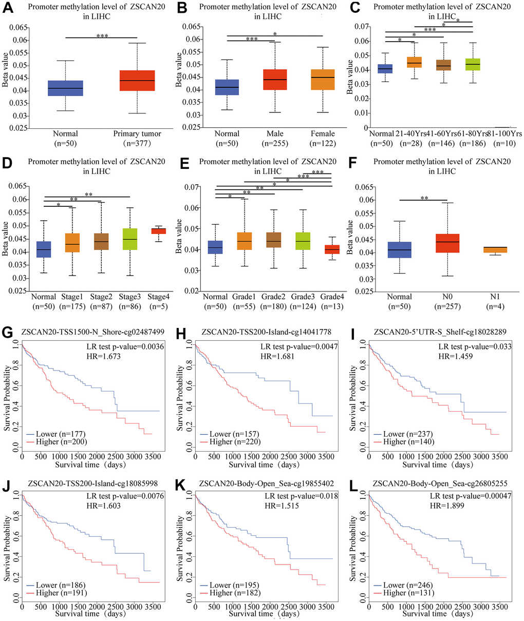 Correlation between ZSCAN20 promoter methylation level and prognostic value of DNA methylation in HCC. (A) normal vs primary tumor, (B) gender, (C) age, (D) cancer stage, (E) tumor grade, (F) lymph node metastasis status; *P < 0.05; **P < 0.01;***P < 0.001. High methylation level of cg02487499 (G), cg14041778 (H), cg18028289 (I), cg18085998 (J), cg19855402 (K) and cg26805255 (L) correlated with worse OS.