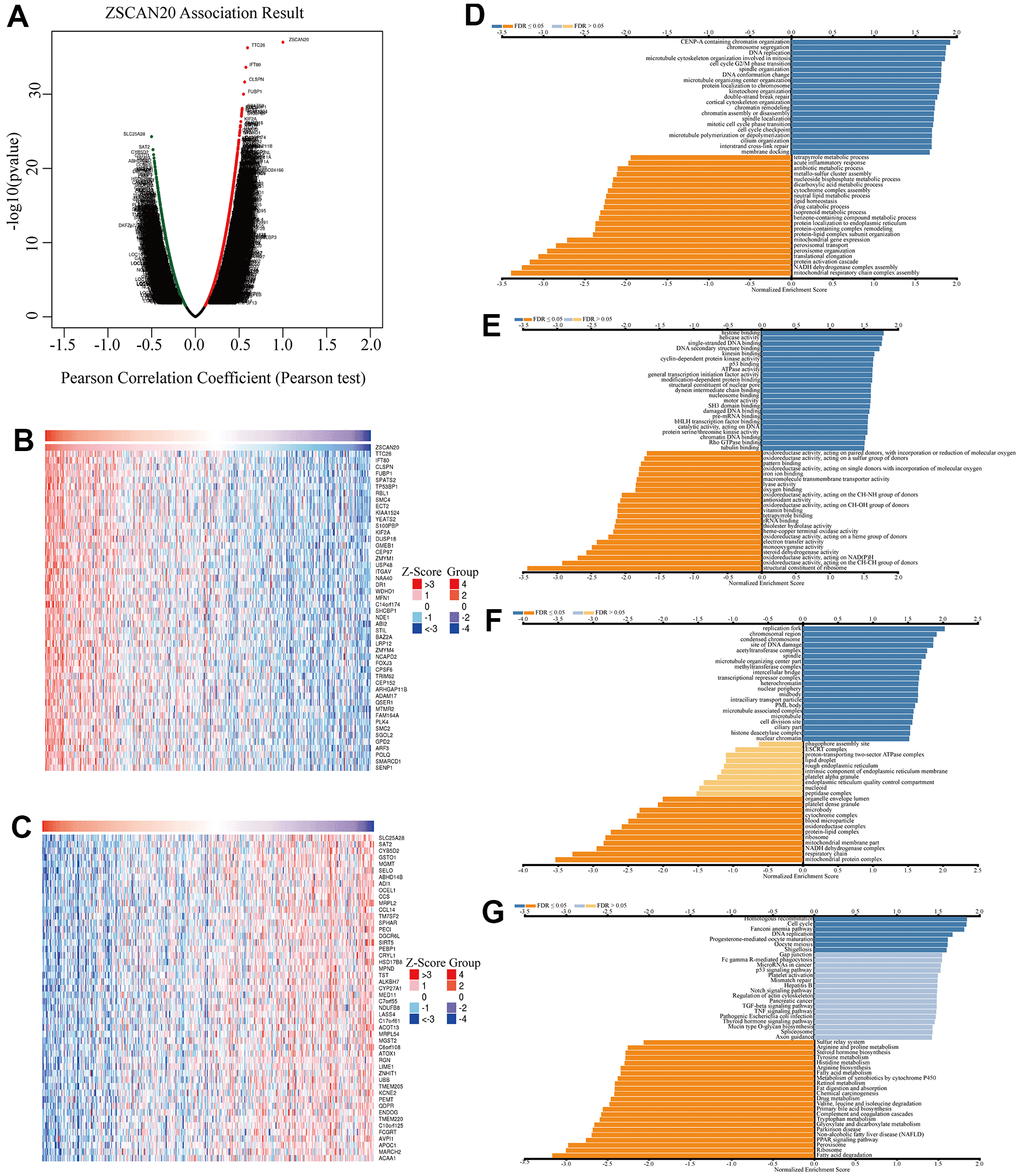 Co-expression genes of ZSCAN20 in HCC. (A) Volcano plot of genes highly correlated with ZSCAN20 identified by the Pearson test in LIHC. Red and green dots represent genes significantly positively and negatively correlated with ZSCAN20, respectively. Heatmaps of the top 50 genes (B) positively and (C) negatively correlated with ZSCAN20. (DG) Significantly enriched GO and KEGG pathways of ZSCAN20. GO: Gene Ontology; KEGG: Kyoto Encyclopedia of Genes and Genomes.