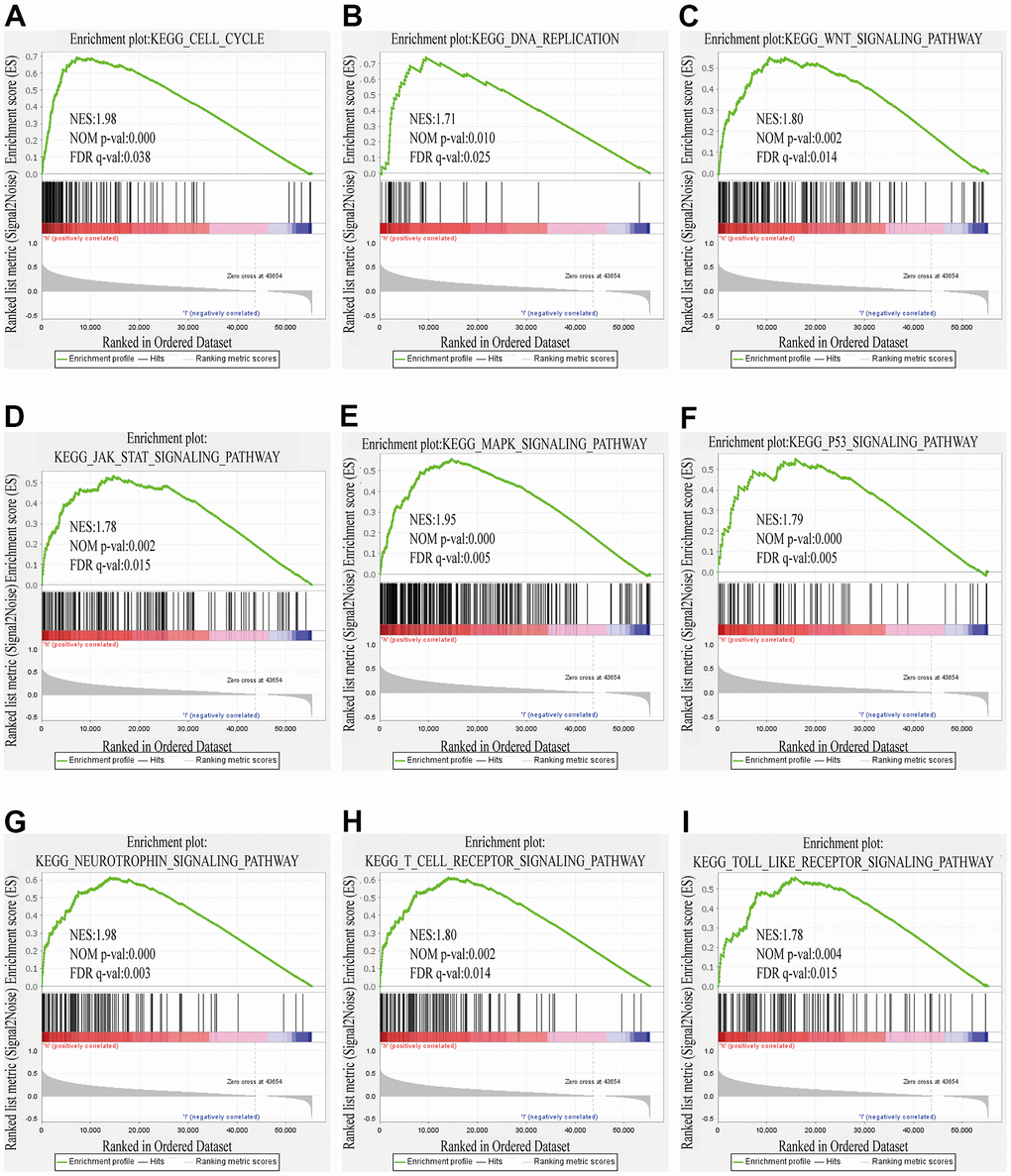GSEA results showed differential enrichment of genes with high ZSCAN20 expression. (A) Cell cycle. (B) DNA replication. (C) WNT signaling pathway. (D) JAK STAT signaling pathway. (E) MAPK signaling pathway. (F) P53 signaling pathway. (G) Neurotrophin signaling pathway. (H) T cell receptor signaling pathway. (I) Toll like receptor signaling pathway. NES, normalized enrichment score; ES, enrichment score; FDR, false discovery rate.
