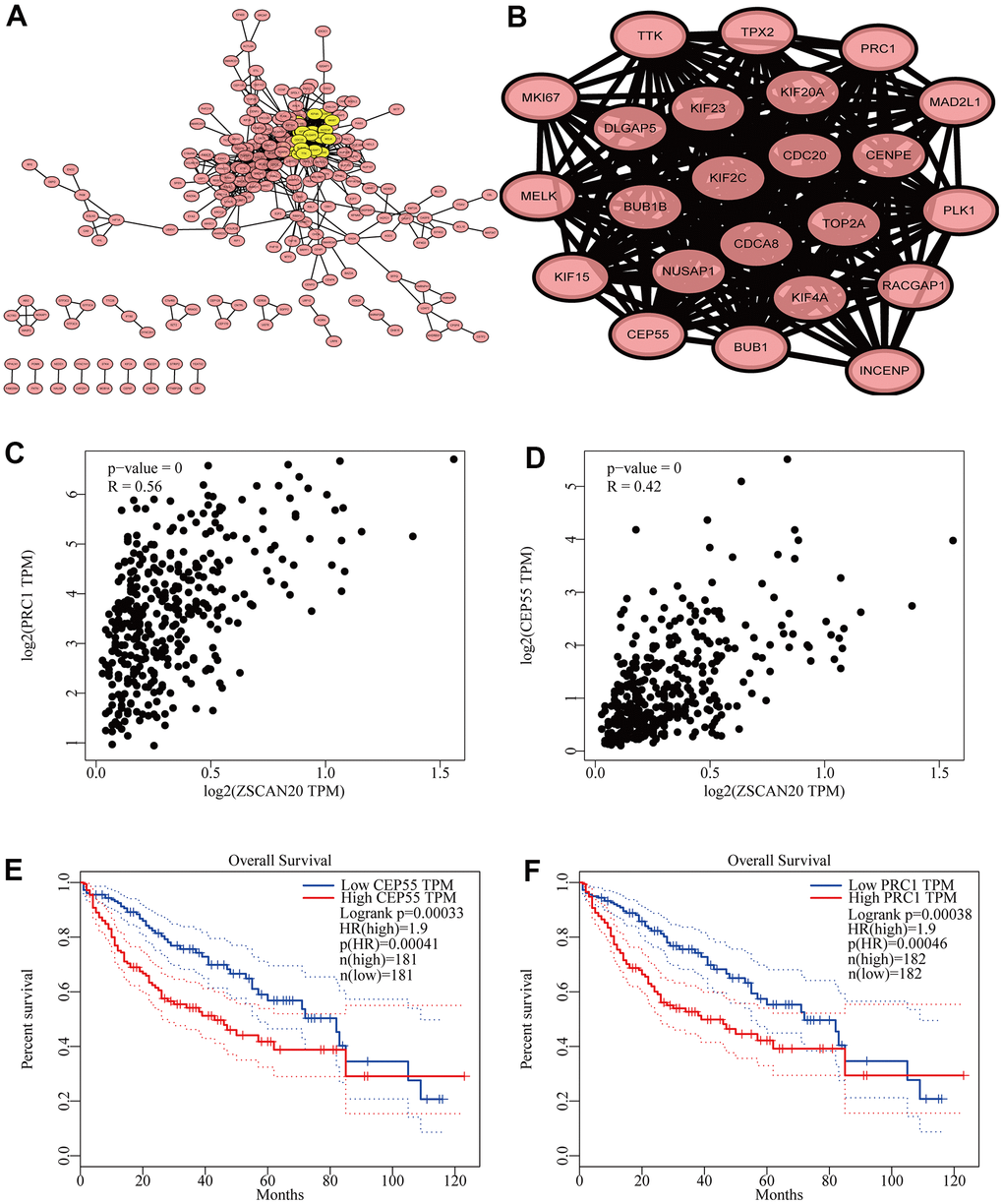 In order to further study its potential biological functions, the PPI results showed that the first 23 genes associated with ZSCAN20 were correlated with the cell cycle. It was well known that the anomalous expression of cell cycle related proteins may affect cell growth and chromosomal instability, causing cancer progression. We selected the two co-expressed genes (PRC1 and CEP55) with the highest cluster scores and found that they had a strong correlation with ZSCAN20. Subsequently, we conducted survival analysis of these two genes, and the results indicated their high expression can cause poor prognosis. Studies have pointed out that the dysregulation of the protein regulator 1 (PRC1) of cytokinesis led to cytokinesis defects in the cell cycle, which in turn promoted chromosomal instability (CIN), thereby promoting tumor heterogeneity and cancer progression [49]. In addition, the absence of CEP55 leads to mitotic arrest and mitotic cell death in the cell cycle, and CEP55 has been proven to be an anti-mitotic drug targeting the mitotic mechanism of the cell cycle to eliminate cancer cells [50]. This implied that ZSCAN20 may get involved in HCC through its association with cell cycle-related signal pathways.