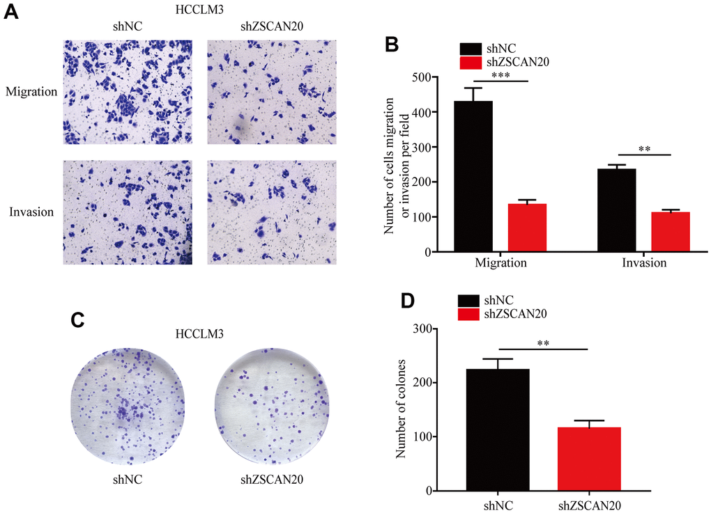 Transwell and colony formation assays. (A, B) Migration and invasion capacity for HCC cells treated with shZSCAN20 or shNC was detected by Transwell separately. **p < 0.01, ***p < 0.001. (C, D) Colonies formed by HCCLM3 cells transfected with control shRNA or shRNA targeting ZSCAN20. The right panels are quantification of the results of the colony formation assay.