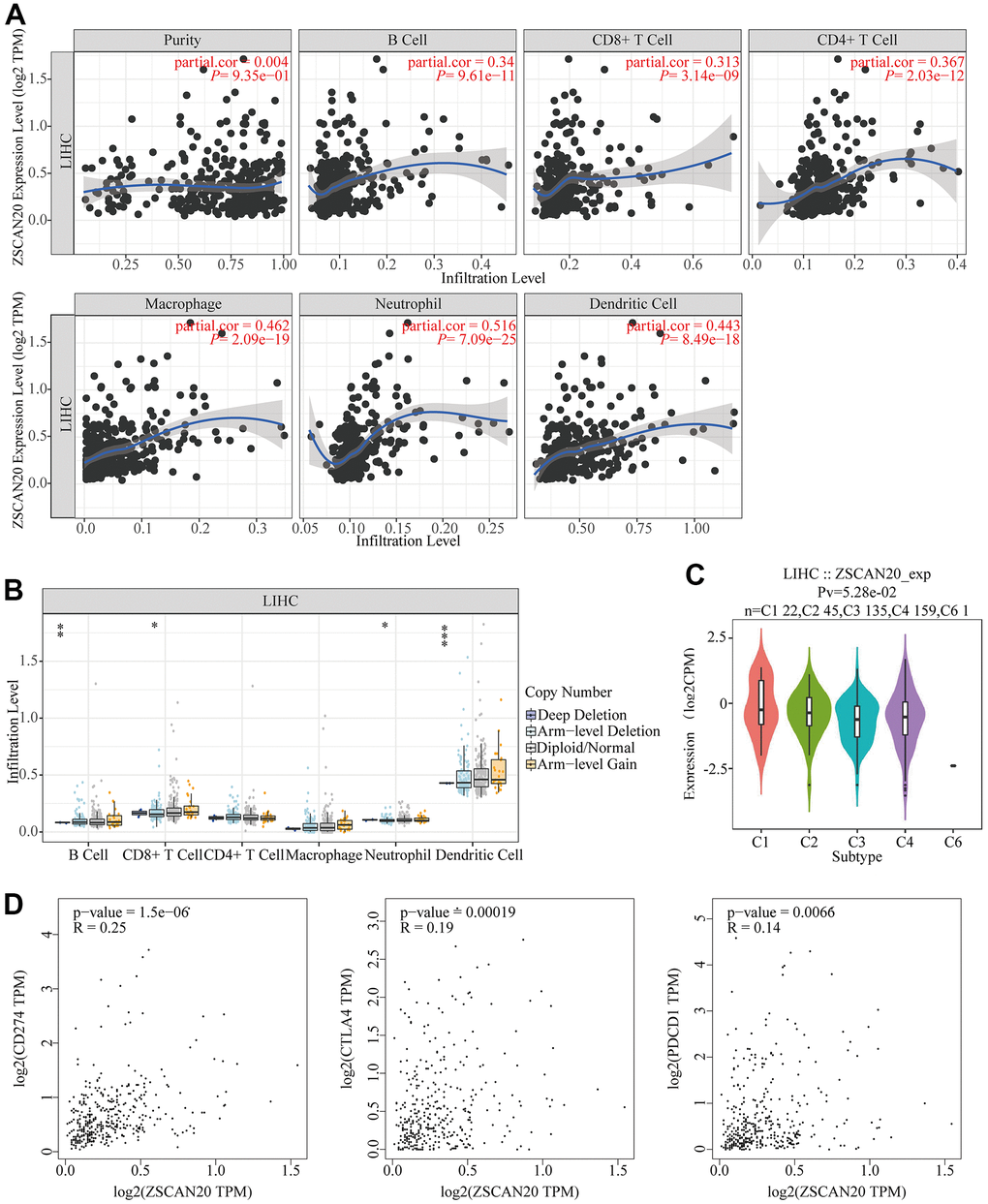 Association between ZSCAN20 and immune cell infiltration in HCC. (A) ZSCAN20 showed a significant correlation with the infiltrating abundance of B cell, CD8+ T cell, CD4+ T cell, Macrophage, Neutrophil, and Dendritic cell using the TIMER database. (B) The relationship between ZSCAN20 CNV and immune infiltration.*p < 0.05, **p < 0.01, ***p < 0.00. (C) Distribution of ZSCAN20 expression across immune subtypes in LIHC (TISIDB). The different color plots represent the five immune subtypes (C1: wound healing; C2: IFN-gamma dominant; C3: inflammatory; C4: lymphocyte-depleted and C6: TGF-b dominant). (D) Scatter plots of the correlations between ZSCAN20 expression and CD274, CTLA4 and PDCD1 in LIHC using the GEPIA database.
