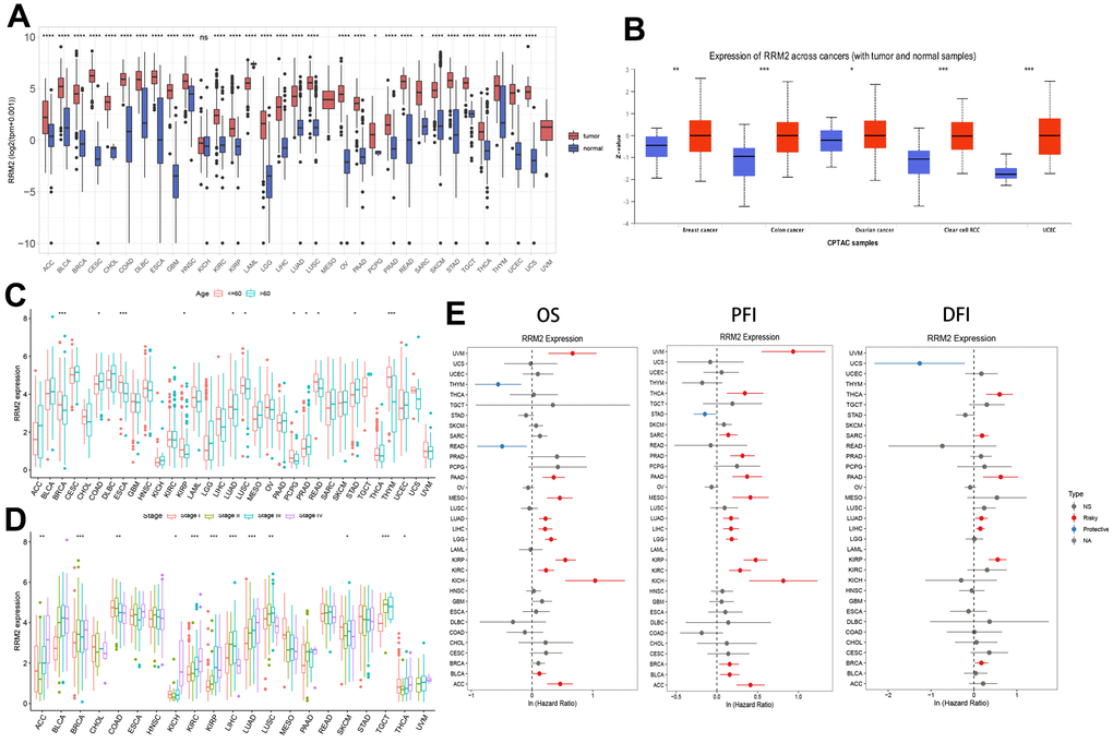 The original data of 33 types of cancers were obtained from the public database TCGA and downloaded from the UCSCXenaShiny website (https://xena.ucsc.edu/). We searched RRM2 expression and retrieved data regarding overall survival (OS), progression-free interval (PFI), and disease-free interval (DFI) through the UCSCXenaShiny website [19]. Based on the Clinical Proteomic Tumor Analysis Consortium (CPTAC) dataset (http://ualcan.path.uab.edu/analysis-prot.html), we analyzed the differences in RRM2 protein level between normal and tumor tissue samples [20]. According to the clinical data of TCGA, the RRM2 expression levels among patients belonging to different age groups and pathological stages were analyzed.