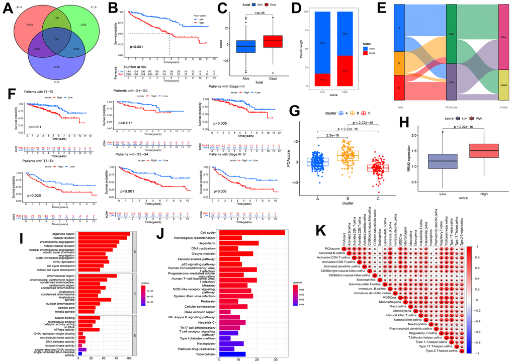The above analyses could not include other RRM2-co-expression genes and evaluate the biological function and significance of RRM2 comprehensively. Therefore, we constructed a risk score based on prognostic DEGs of different clusters (Figure 7A). Results indicated that patients exhibited a significantly shorter survival time in the high score group (Figure 7B–7D, 7F). The relationship between cluster and score is depicted in detail in Figure 6G, whereas the Sankey diagram indicated the connection between cluster, risk score, and outcome (Figure 7E). As we can see, cluster B was associated with the high-score group, which meant a poor prognosis. Also, we annotated the prognostic DEGs’ function (Figure 7I, 7J) and assessed that the risk score was positively correlated with immune infiltration levels (Figure 7K).