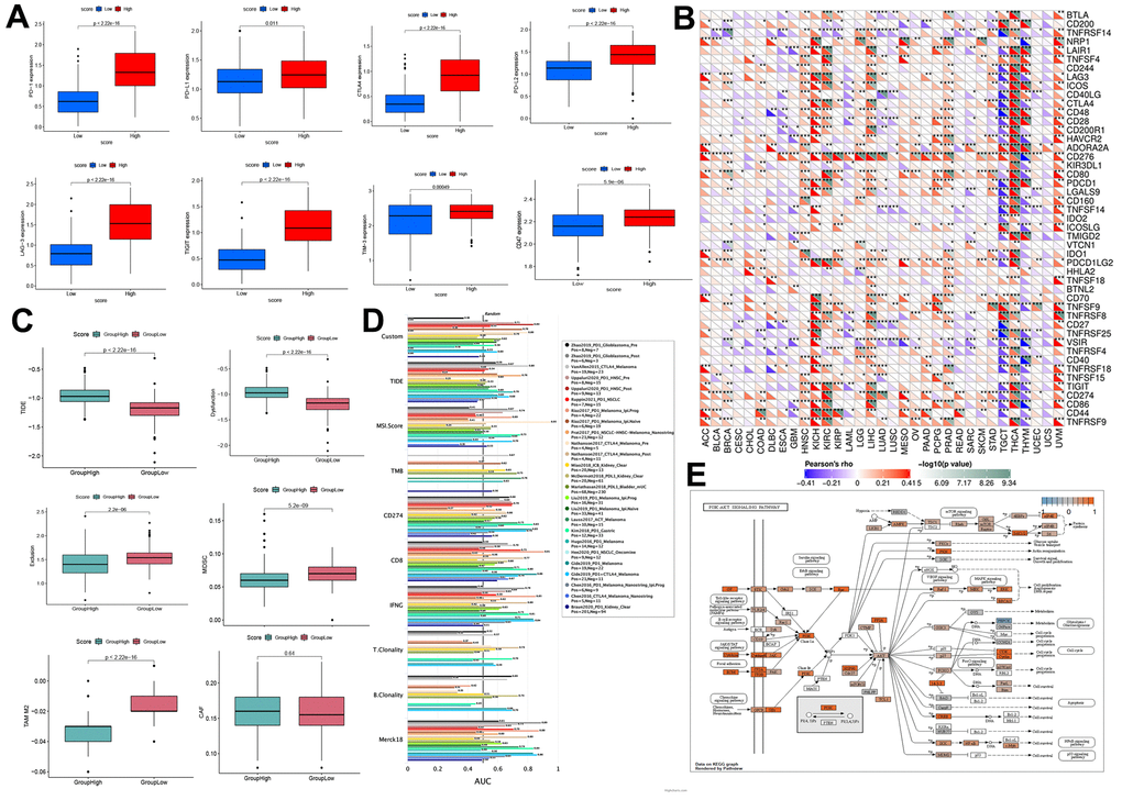 Studies have indicated that the tumor microenvironment facilitates immunosuppression and limits immunotherapy responses [16]. In the last decade, immune infiltration, which might be a promising target in the tumor microenvironment, has gained attention in tumor progression and immunotherapy resistance [17]. We performed a pan-cancer analysis of the potential correlation between RRM2 gene expression and stromal score, immune score, tumor-infiltrating immune cells, and immune factors (Figure 4). Results indicated that the ncRNAs and RNA modification-mediated overexpression of RRM2 had a significant correlation with immune factors. We also identified three distinct patterns, which were correlated with different immune phenotypes and signaling pathways. Results indicated that KEGG pathways were negatively enriched in immune-related biological processes, including T cell receptor signaling pathway, natural killer cell-mediated cytotoxicity, primary immunodeficiency, the intestinal immune network for IgA production, and the P53 signaling pathway in the high-expression cluster of RRM2. Previous studies have demonstrated that ICIs are the main methods of immunotherapy [18]. In this study, further analyses revealed that PD-1, CTLA-4, PD-L1, PD-L2, LAG-3, TIM-3, TIGIT, and CD47 were significantly upregulated in the high-risk score group, implying that RRM2 could affect the efficacy of immunotherapy. Meanwhile, a key finding of this study was that patients in the low-score group exhibited a response to immunotherapy in KIRC. We discovered that the risk scores were positively correlated with the TIDE score and T cell dysfunction. The low-risk score group exhibited a better immunotherapy effect compared to the high-risk score group, indicating that a high-risk score group with high RRM2 expression might lead to the failure of ICI therapy. A similar result was reported in a study, wherein RRM2 overexpression reduced sunitinib sensitivity in renal cancer patients [10]. And we found RRM2 regulated the ICI resistance through the PI3K-AKT single pathways.