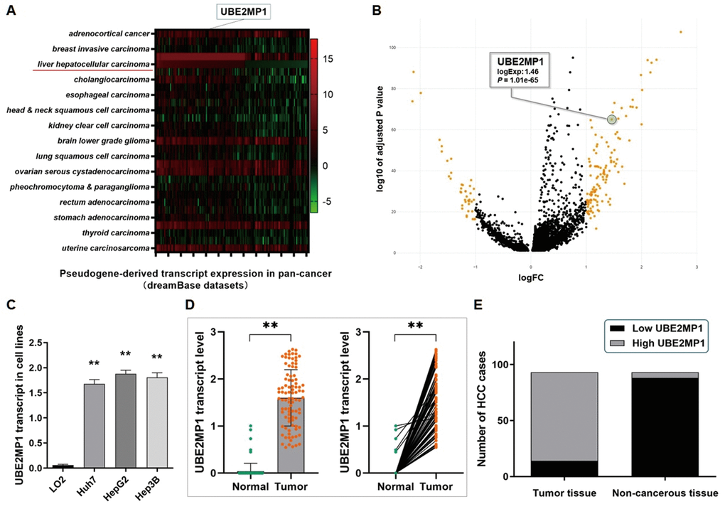 The exploration and analysis of the datasets from the dreamBase databases indicated a universal transcription of UBE2MP1 in either pan-cancers or HCC (Figure 1A). On basis of a random walk-based multi-graphic (RWMG) model algorithm we developed, a series of pseudogenes generating lncRNA-like transcripts in HCC were screened out from the analysis tools of the Liver Cancer lncRNA Explore (LCLE) online tool (https://datasciences123.shinyapps.io/LCLE/) [13], and UBE2MP1 and the volcano plot that presents the expression profile of the pseudogene transcript indicated a similar result (Figure 1B). As we observed, merely no detectable UBE2MP1 transcript was found in the normal organs and tissues, including the liver. Whereas, the up-regulation of the UBE2MP1 transcript was detected in different tumor tissues. Especially for HCC, the remarkable elevation of the UBE2MP1 transcript was observed.