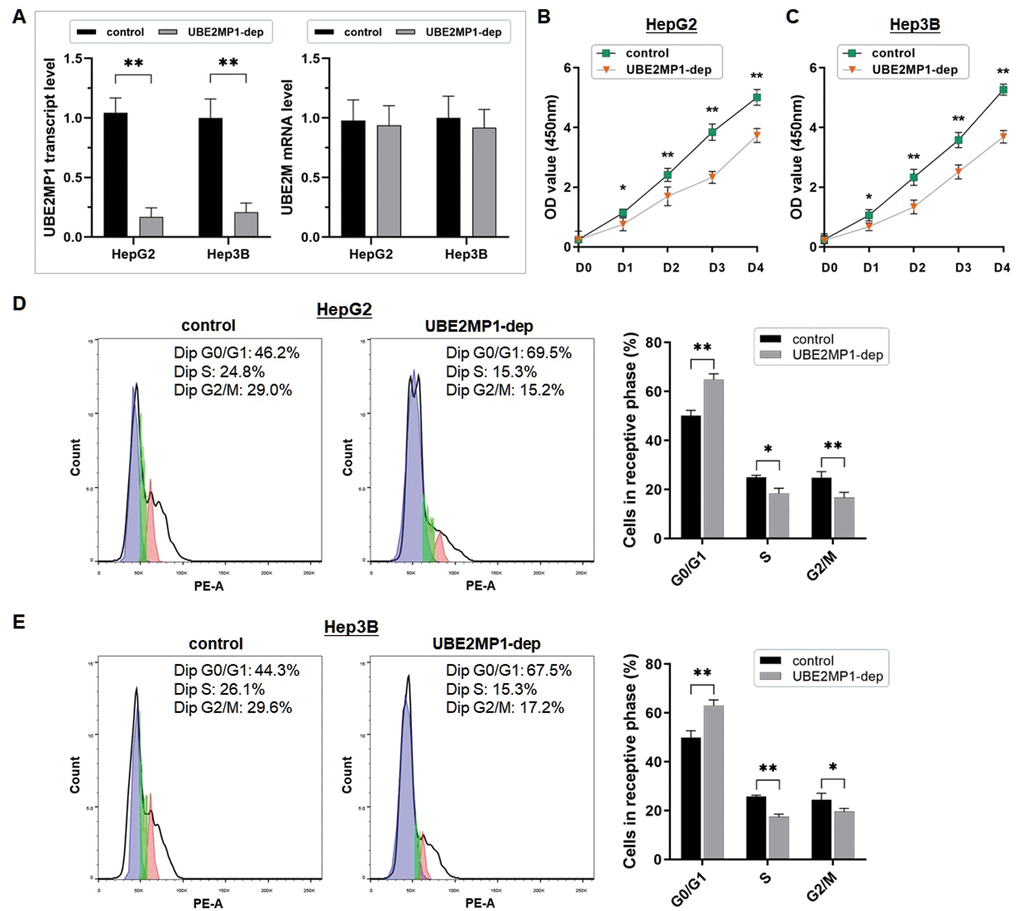 The RT-qPCR assay was conducted to validate the effect on UBE2MP1 depletion, in both HepG2 and Hep3B cells, and the expression of the parental gene was not affected (Figure 2A). The cell proliferation was significantly suppressed in both the two cell lines by abrogating the UBE2MP1 transcript (unpaired Student's t-test; *P<0.05; **P<0.01) (Figure 2B, 2C).