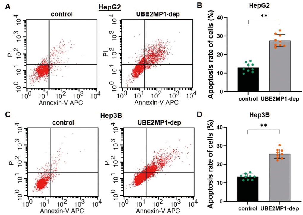 The flow cytometric analysis was applied for calculating the statuses of cell apoptosis by an unpaired Student's t-test. The cell apoptosis rates in both HepG2 and Hep3B cells were significantly increased (HepG2: from 13.01% to 27.59%, P<0.01; Hep3B: from 13.27% to 25.71%, P<0.01) following the depletion of UBE2MP. This finding suggested that the transcription of UBE2MP1 in HCC could enhance cell maintenance by inhibiting cell apoptosis (Figure 3A–3D).