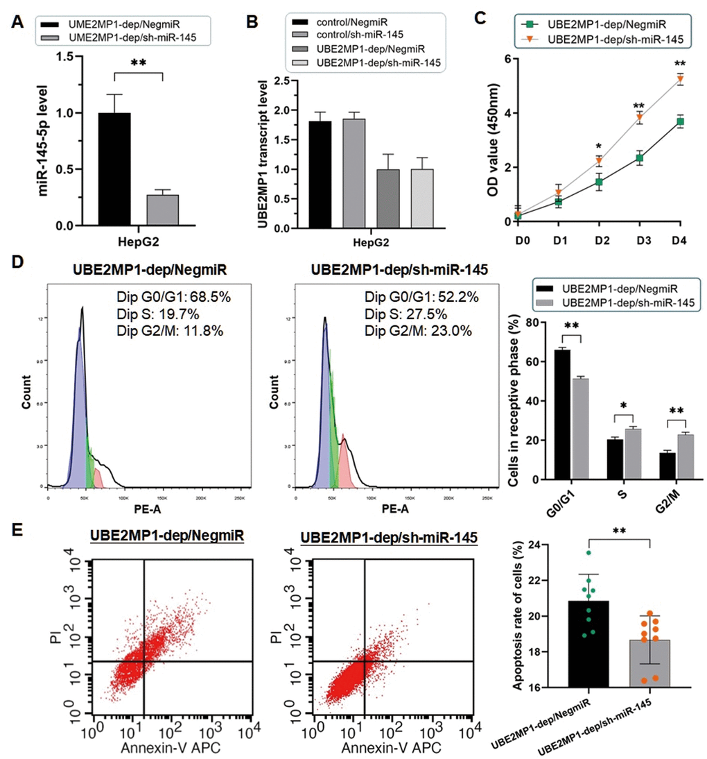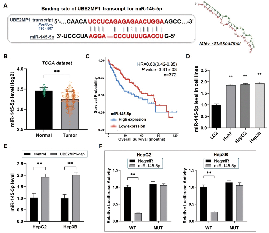 Wondering the exact mechanism of UBE2MP1 in promoting HCC growth, we investigated the possibility of the ceRNA effect implemented by its pseudogene-derived transcript. MiR-145-5p has been reported mainly to play the tumor-suppressive role in multiple malignancies. For instance, miR-145-5p induces tumor cell apoptosis in prostate cancer by degrading WIP1 [24]; MiR-145-5p is extremely decreased in breast cancer and attenuates paclitaxel resistance and suppresses the progression of breast cancer cells by targeting SOX2 [25]. For liver cancer, recent reports have noticed the tumor-suppressive effects of miR-145-5p in either cholangiocarcinoma or HCC by targeting different mRNAs, like CDCA3, and SPATS2, and involved in cell proliferation, apoptosis, or metastasis [26, 27]. Thus, we suppose that miR-145-5p is a key pivot of multiple regulating axes, impacting HCC progress and development through different mechanisms.